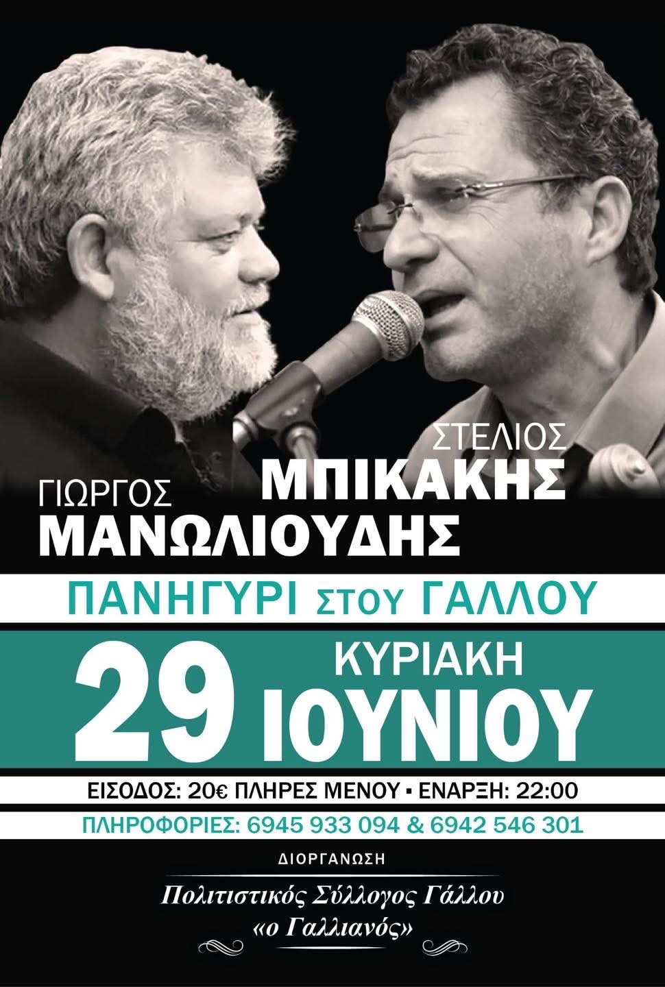 Ο Πολιτιστικός Σύλλογος του Γάλλου «Ο Γαλλιανός» διοργανώνει την ετήσια χοροεσπερίδα του και σας προσκαλεί την Κυριακή 28 Ιουνίου στο χωριό Γάλλου, να περάσουμε μία όμορφη και αξέχαστη βραδιά παρέα με τον Στέλιο Μπικάκη, το Γιώργη Μανωλιούδη και το συγκρότημα τους!