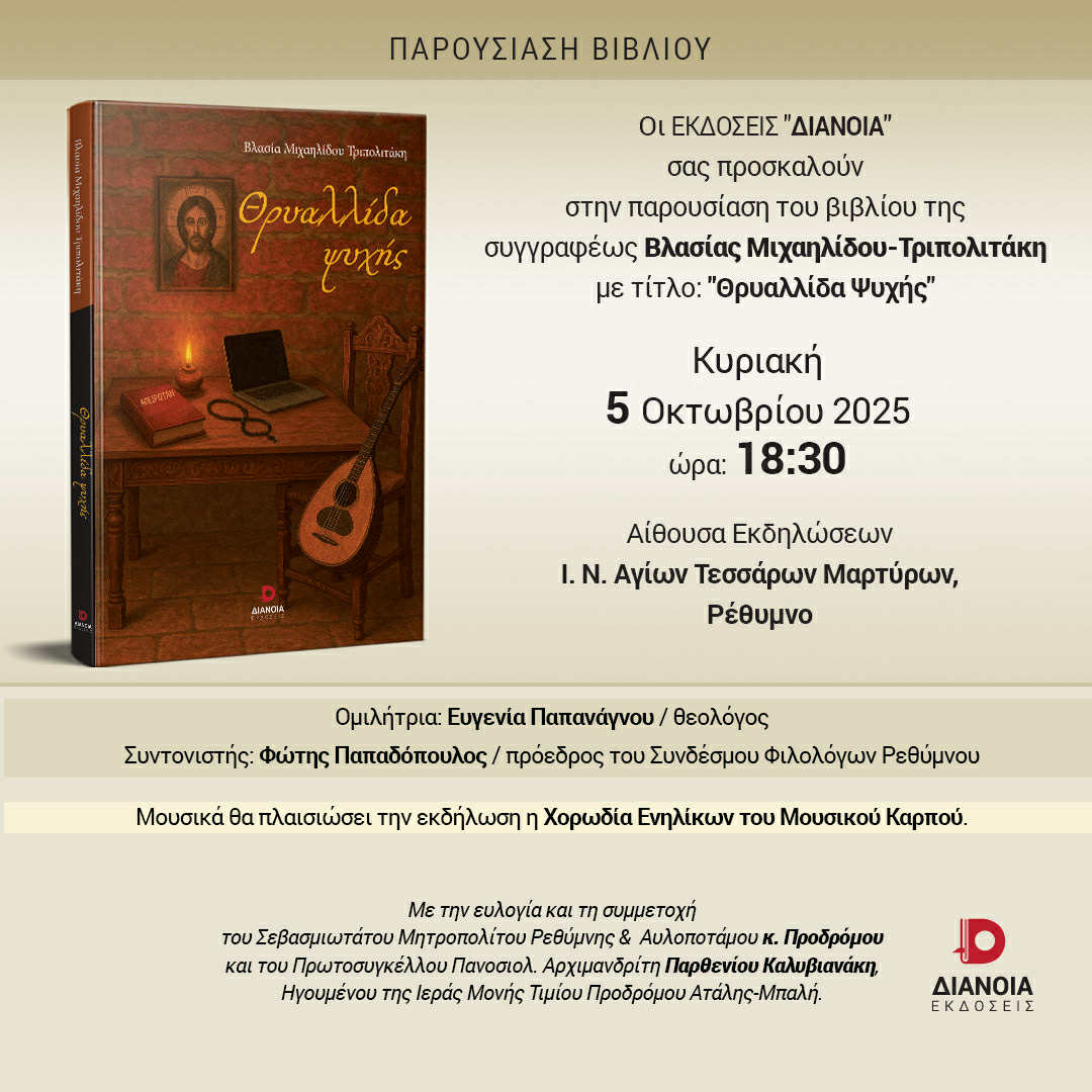Οι ΕΚΔΟΣΕΙΣ «ΔΙΑΝΟΙΑ» μας προσκαλούν στην παρουσίαση του βιβλίου της συγγραφέως Βλασίας Μιχαηλίδου-Τριπολιτάκη με τίτλο «Θρυαλλίδα Ψυχής», την Κυριακή 5 Οκτωβρίου, και ώρα 18:30 στην αίθουσα εκδηλώσεων του Ι.Ν. των Αγίων Τεσσάρων Μαρτύρων.