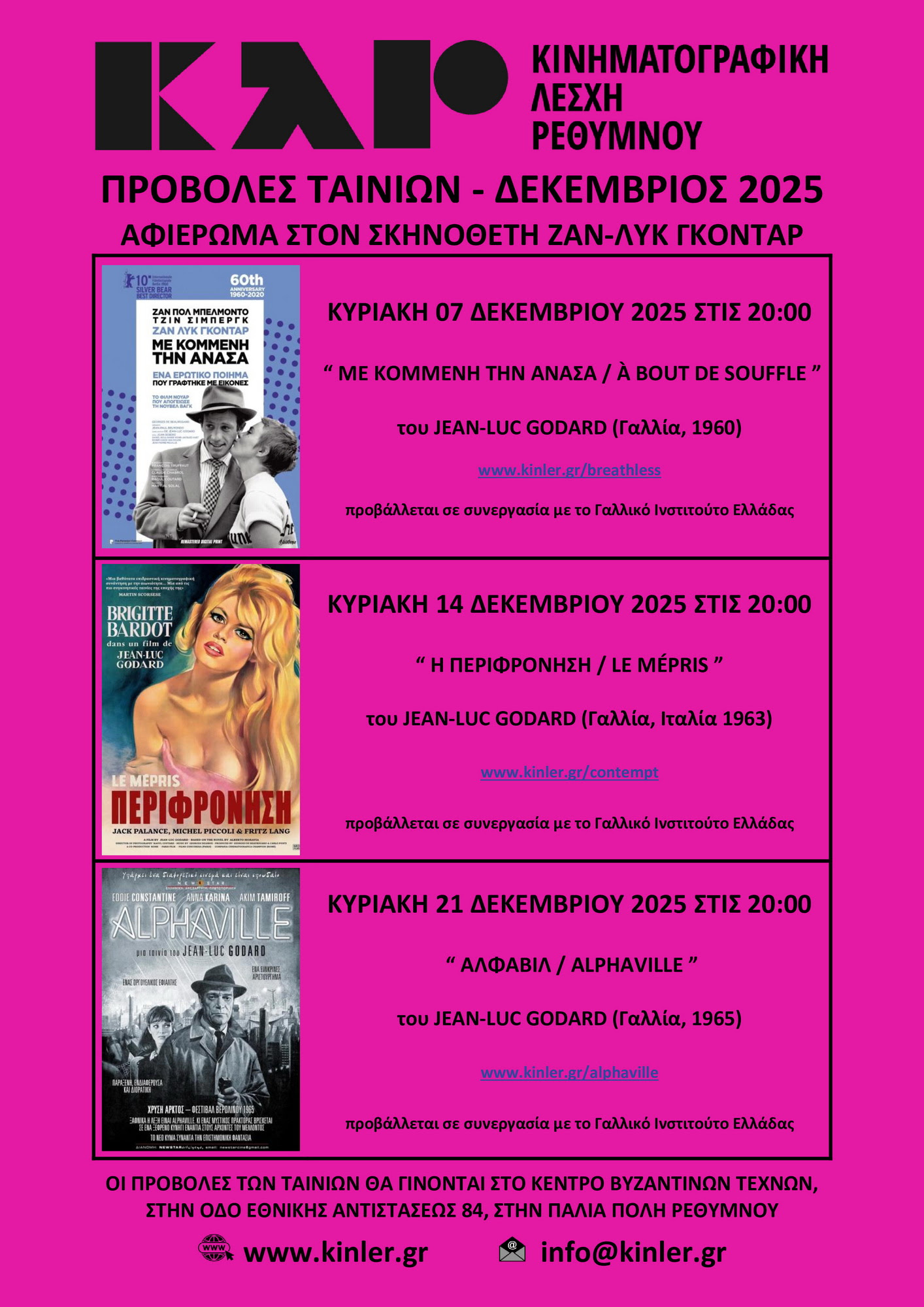 Η Κινηματογραφική Λέσχη Ρεθύμνου σε συνεργασία με το Γαλλικό Ινστιτούτο Ελλάδας, διοργανώνει για τον Δεκέμβριο του 2025 ένα αφιέρωμα στον Γάλλο σκηνοθέτη Ζαν-Λυκ Γκοντάρ, βασικό εκπρόσωπο του γαλλικού νέου κύματος (Nouvelle Vague).