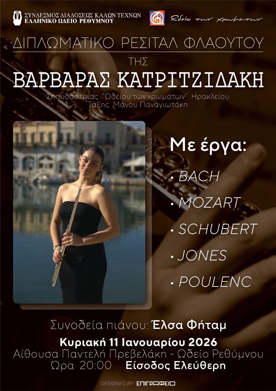 Ρεσιτάλ φλάουτου της Βαρβάρας Κατριτζιδάκη θα πραγματοποιηθεί την Κυριακή 11 Ιανουαρίου στο Ρέθυμνο.