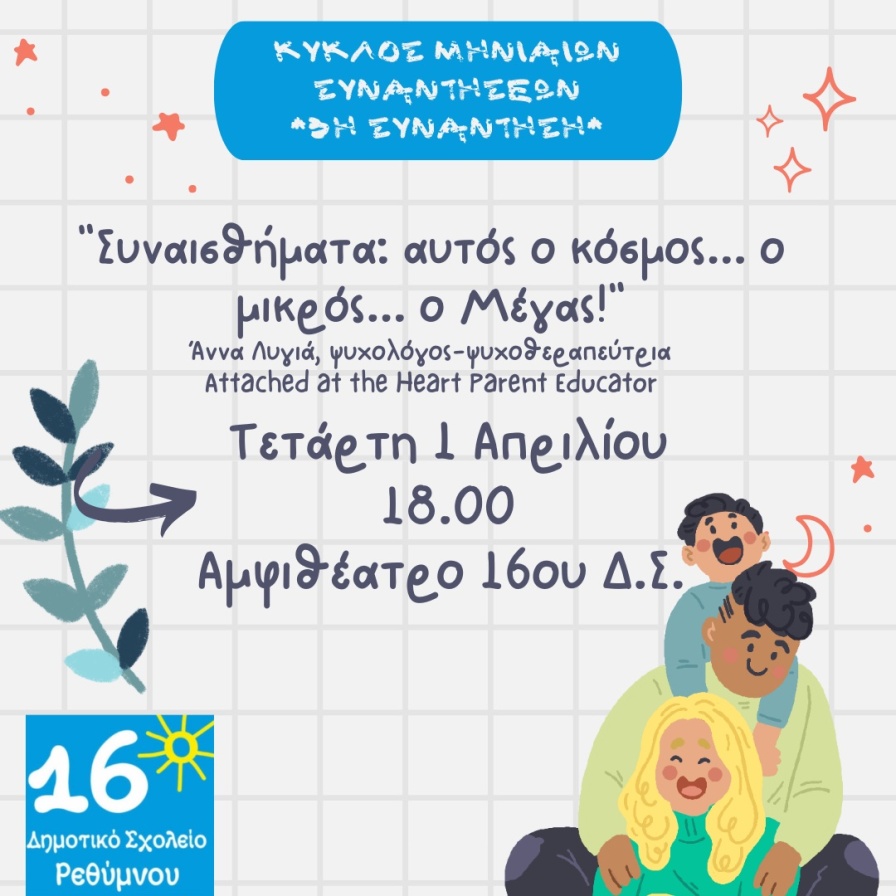 Ο Σύλλογος Γονέων και Κηδεμόνων του 16ου Δημοτικού Σχολείου Ρεθύμνου διοργανώνει μία συνάντηση με την ψυχολόγο – ψυχοθεραπεύτρια – Attached at the Heart Parent Educator, κα Άννα Λυγιά.