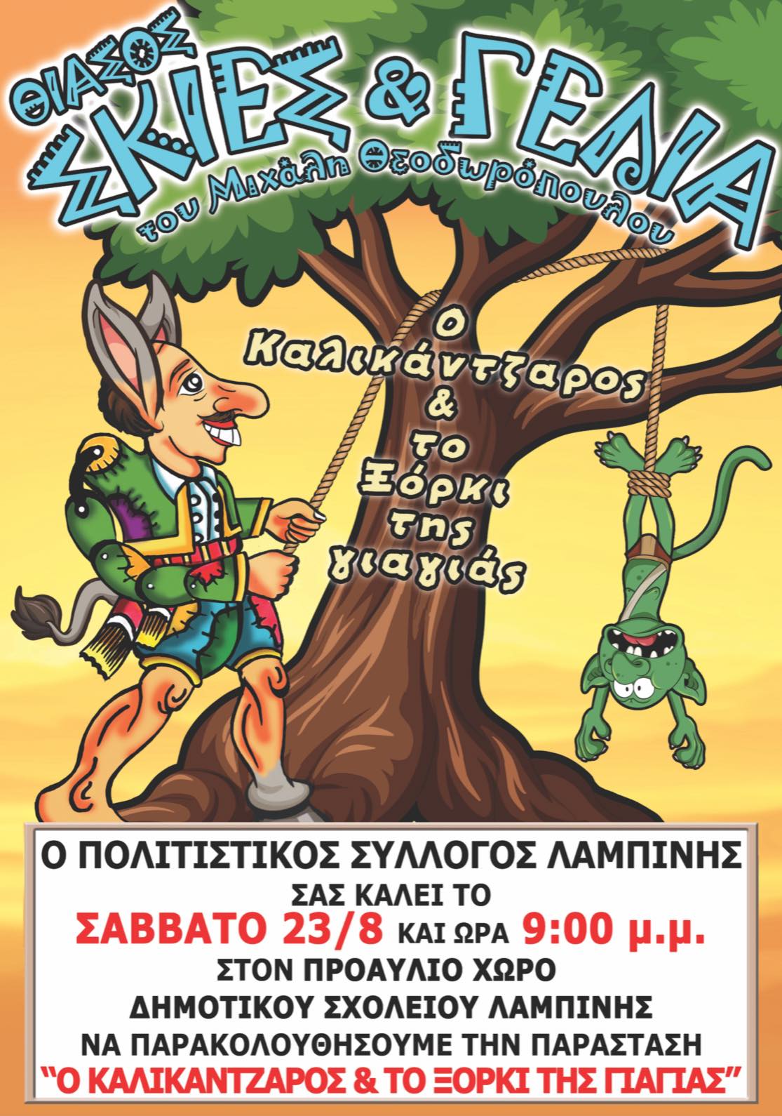 Ο Πολιτιστικός Σύλλογος Λαμπινής διοργανώνει παράσταση θεάτρου σκιών το Σάββατο 23 Αυγούστου στις 9:00 μ.μ., στον προαύλιο χώρο του Δημοτικού Σχολείου Λαμπινής.