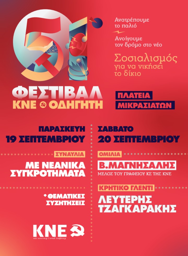 Το 51ο Φεστιβάλ ΚΝΕ «Οδηγητή» με κεντρικό σύνθημα «Ανατρέπουμε το παλιό. Ανοίγουμε δρόμο στο νέο. Σοσιαλισμός για να νικήσει το δίκιο» θα πραγματοποιηθεί στο Ρέθυμνο την Παρασκευή 19 Σεπτεμβρίου και το Σάββατο 20 Σεπτεμβρίου στην πλατεία Μικρασιατών.