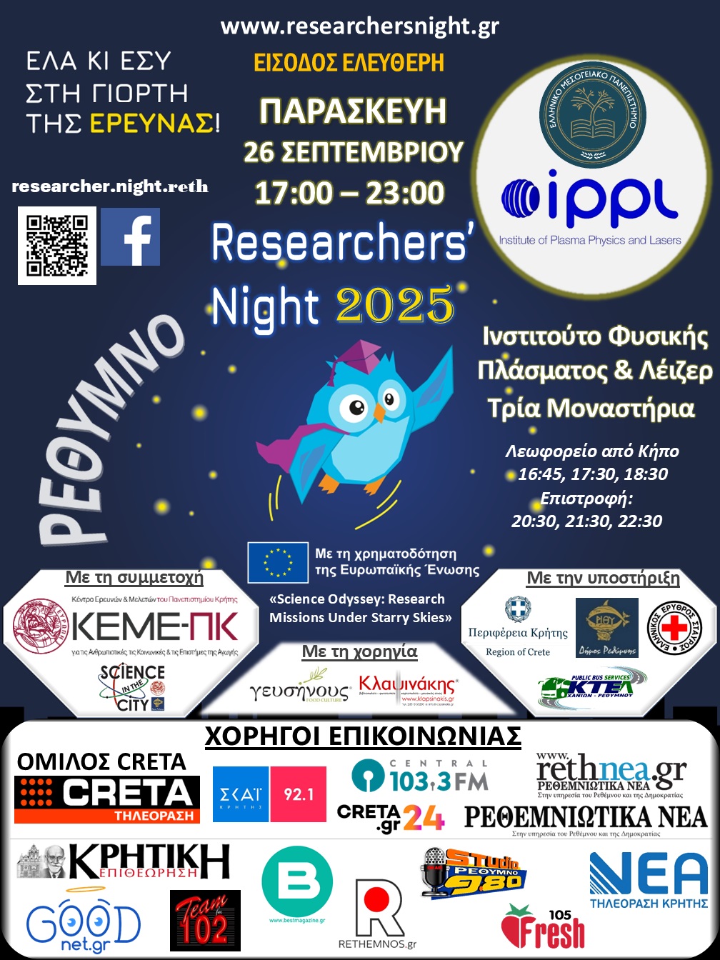 Η Βραδιά του Ευρωπαϊκού θεσμού Researchers’ Night θα πραγματοποιηθεί την ΠΑΡΑΣΚΕΥΗ 26 ΣΕΠΤΕΜΒΡΙΟΥ από τις 17:00 στο Ινστιτούτο Φυσικής Πλάσματος & Λέιζερ (ΙΦΠΛ) του Ελληνικού Μεσογειακού Πανεπιστημίου στα Τρία Μοναστήρια στο Ρέθυμνο.