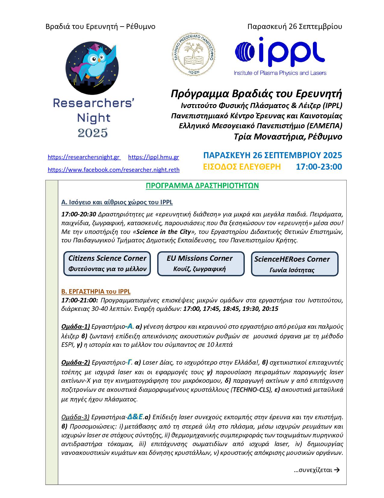 Με τη συνέργεια του Ινστιτούτου Φυσικής Πλάσματος & Λέιζερ, του “Science in the City” του Εργαστηρίου Διδακτικής Θετικών Επιστημών του Παιδαγωγικού Τμήματος Δημοτικής Εκπαίδευσης του Πανεπιστημίου Κρήτης και του Κέντρου Ερευνών και Μελετών (Κ.Ε.ΜΕ.) για τις Ανθρωπιστικές, τις Κοινωνικές και τις Επιστήμες της Αγωγής του Πανεπιστημίου Κρήτης, το πρόγραμμα εκδηλώσεων την Παρασκευή 26/9/2025 θα προσφέρει στο κοινό μια διευρυμένη εκλαϊκευμένη ερευνητική θεματολογία. Ειδικότερα για τα παιδιά, οι δραστηριότητες θα εμπλουτιστούν και φέτος με πειράματα, παιχνίδια, ζωγραφική, κατασκευές και παρουσιάσεις.