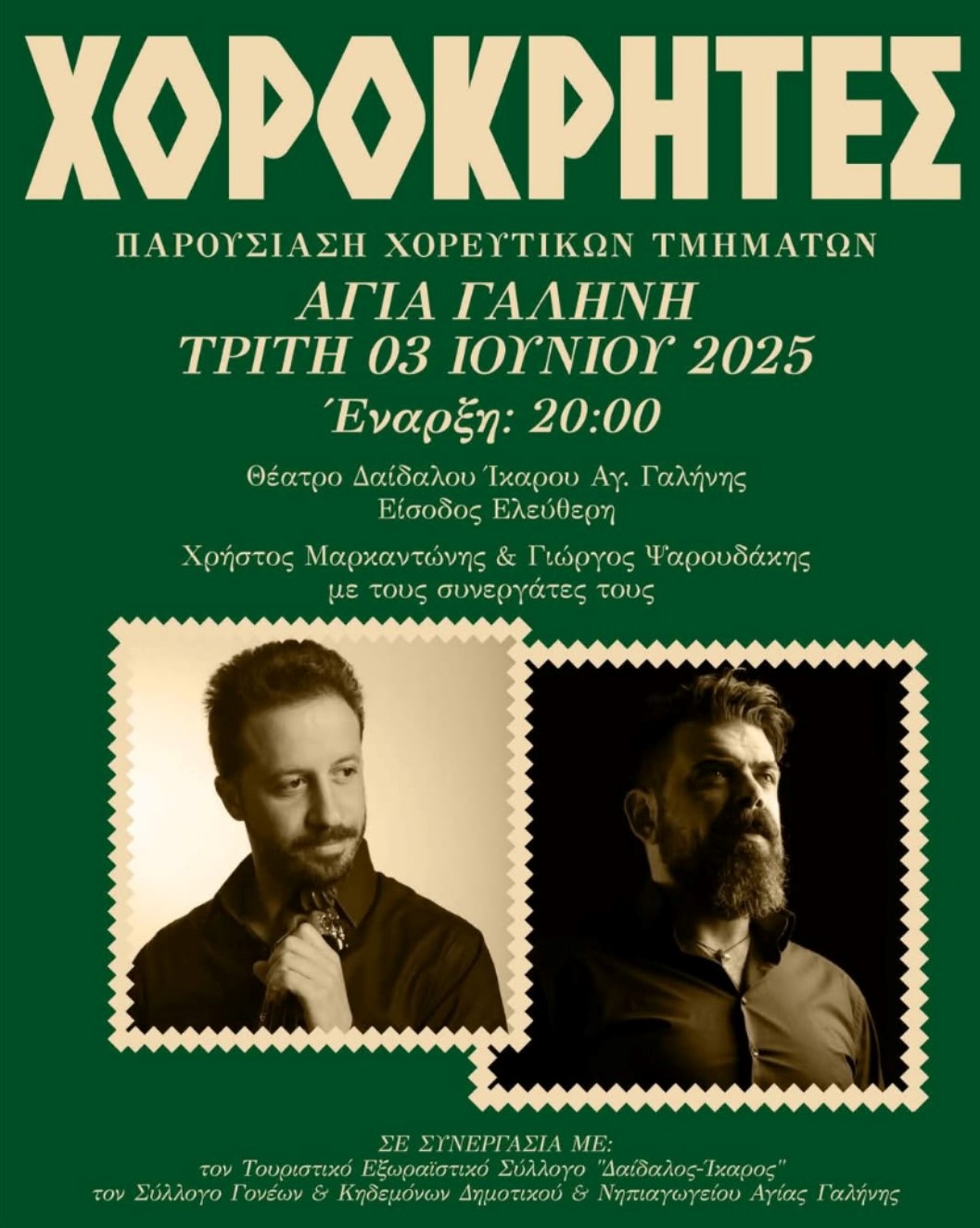 Αγία Γαλήνη Αγία Γαλήνη, Αγία Γαλήν, Ρεθύμνου, ΕλλάδαΤην Τρίτη 3 Ιουνίου 2025, στις 20:00, στο Θέατρο «Δαίδαλου Ίκαρου» στην Αγία Γαλήνη, θα πραγματοποιηθεί η ετήσια παρουσίαση των χορευτικών τμημάτων του συλλόγου "Χοροκρήτες". Στην εκδήλωση συμμετέχουν ο Χρήστος Μαρκαντωνάκης και ο Γιώργος Ψαρουδάκης με τους συνεργάτες τους, προσφέροντας μια βραδιά αφιερωμένη στην κρητική μουσική και τον χορό . Η εκδήλωση διοργανώνεται σε συνεργασία […]