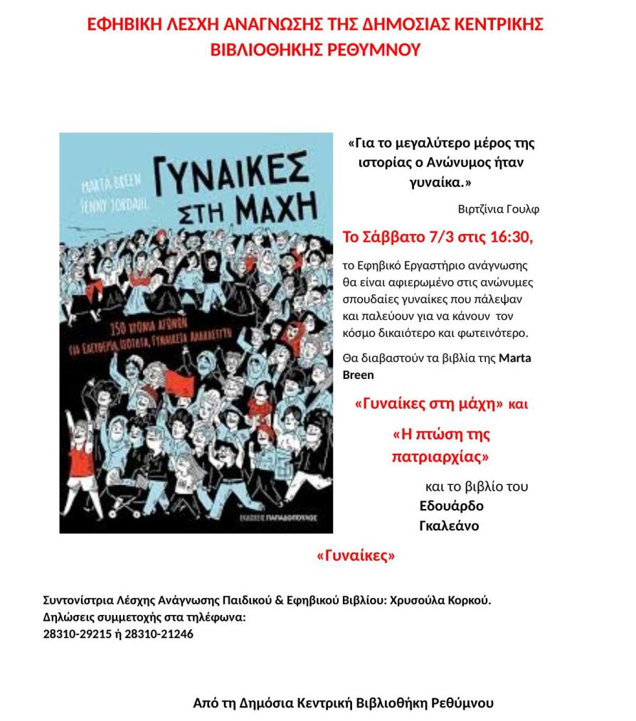 Δημόσια Κεντρική Βιβλιοθήκη Ρεθύμνου Μπίρη 6, Ρέθυμνο, Ρεθύμνου, Ελλάδα«Για το μεγαλύτερο μέρος της ιστορίας ο Ανώνυμος ήταν γυναίκα» Βιρτζίνια Γουλφ Το Σάββατο 7/3 στις 16:30, το Εφηβικό Εργαστήριο ανάγνωσης θα είναι αφιερωμένο στις ανώνυμες σπουδαίες γυναίκες που πάλεψαν και παλεύουν για να κάνουν τον κόσμο δικαιότερο και φωτεινότερο. Θα διαβαστούν τα βιβλία της Μarta Breen «Γυναίκες στη μάχη» και «Η πτώση της πατριαρχίας» […]