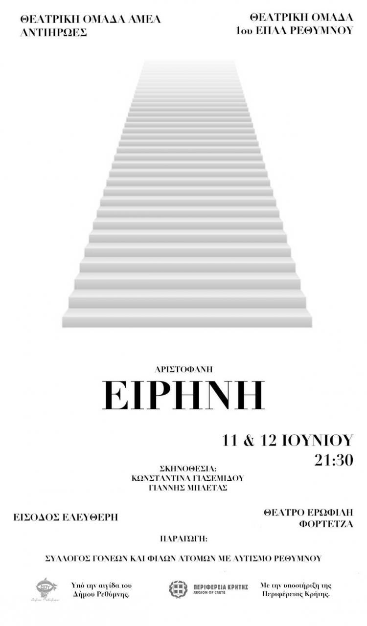 Τετάρτη 11 και Πέμπτη 12 Ιουνίου 2025 Χώρος: Θέατρο Ερωφίλη – Φορτέτσα Ωρα: 21.30 Η μεικτή θεατρική ομάδα Αντιήρωες, του Συλλόγου Γονέων και Φίλων Ατόμων με Αυτισμό, παρουσιάζει τη νέα της θεατρική παραγωγή. Αυτή τη χρονιά συμπράττει με την θεατρική ομάδα του 1ου ΕΠΑΛ Ρεθύμνου και δημιουργούν ένα σύγχρονο αριστοφανικό σύμπαν. "Έμπνευση και οδηγός αποτέλεσε […]