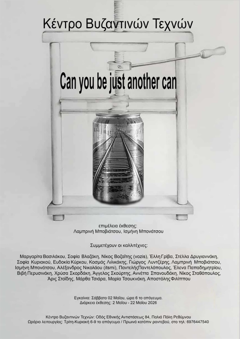 Tο Κέντρο Βυζαντινών Τεχνών (Οδός Εθνικής Αντιστάσεως 84, Παλιά πόλη) παρουσιάζει την ομαδική έκθεση σύγχρονης τέχνης «Can you be just another can», από τις 2 έως τις 22 Μαΐου 2026. […]