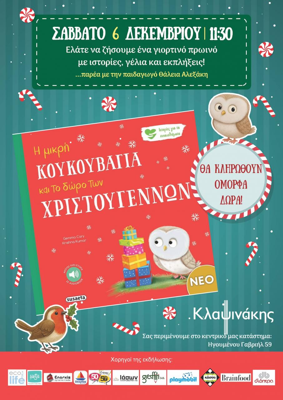 Βιβλιοπωλείο Κλαψινάκης Ηγουμένου Γαβριήλ 59, Ρέθυμνο, Ρεθύμνου, ΕλλάδαΔιαδραστική αφήγηση για παιδιά με τη Θάλεια Αλεξάκη, θα πραγματοποιηθεί στο βιβλιοπωλείο Κλαψινάκης (Λεωφόρος Ηγουμένου Γαβριήλ 59) το Σάββατο 6 Δεκεμβρίου στις 11:30. Η αγαπημένη Θάλεια Αλεξάκη θα ζωντανέψει μέσα […]