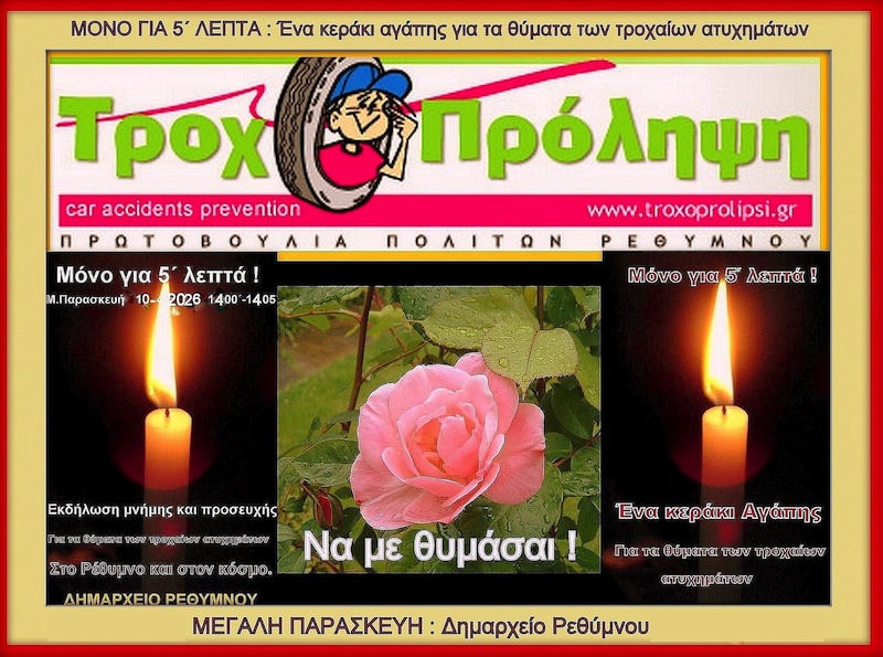 Το μεσημέρι της Μεγάλης Παρασκευής (10/4) στις 14:00, τα μέλη της Πρωτοβουλίας πολιτών Ρεθύμνου για την πρόληψη των τροχαίων ατυχημάτων θα πραγματοποιήσουν έξω από το Δημαρχείο Ρεθύμνου, για 5 λεπτά, εκδήλωση μνήμης, περισυλλογής και προσευχής, για τα θύματα των τροχαίων ατυχημάτων στο Ρέθυμνο. Εις μνήμη των θυμάτων τροχαίων ατυχημάτων, θα τελεστεί Τρισάγιο από τον Μητροπολίτη […]