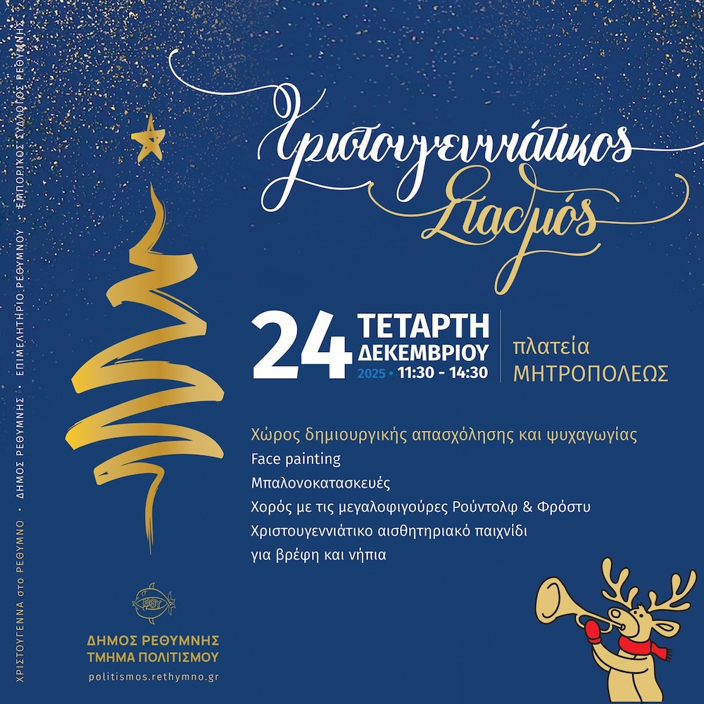 Ιερός Ναός Αγίου Γεωργίου Πεταλιώτου Σικελιανού 10, Ρέθυμνο, Ρεθύμνου, ΕλλάδαΟ Δήμος Ρεθύμνης, το Επιμελητήριο Ρεθύμνου και ο Εμπορικός Σύλλογος Ρεθύμνου προσκαλούν μικρούς και μεγάλους σε μία γιορτινή δράση με τίτλο «Το Ξωτικό της Χαράς», το Σάββατο 20 Δεκεμβρίου 2025, […]