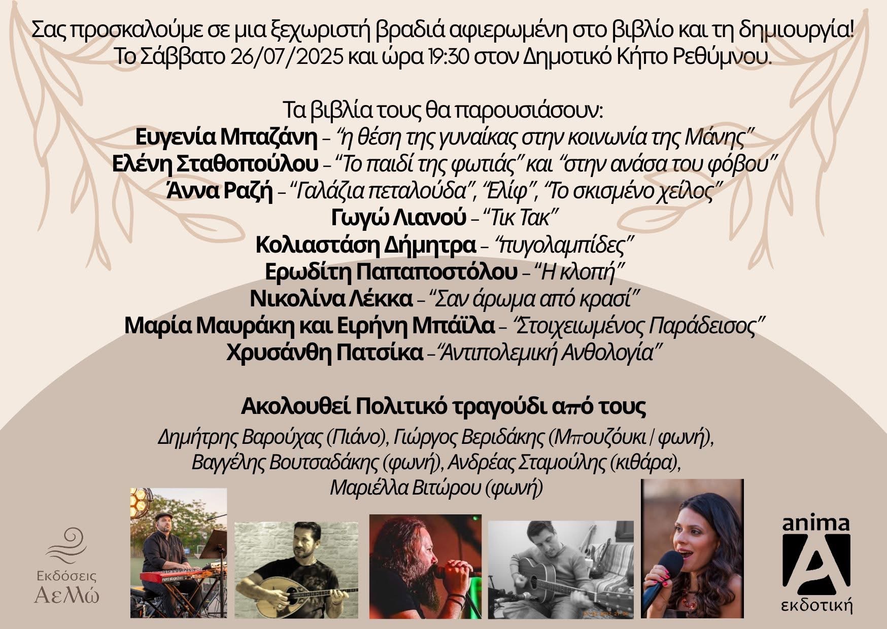 Ανώγεια Ανώγεια, Ανώγεια, Ρεθύμνου, ΕλλάδαΜια ξεχωριστή εκδήλωση αφιερωμένη στον Μανόλη Φασουλά, μαθηματικό και λογοτέχνη, θα πραγματοποιηθεί την Κυριακή 10 Αυγούστου 2025, στις 9 το βράδυ, στην πλατεία Αρμί στα Ανώγεια. Αφορμή αποτελεί η παρουσίαση του νέου του βιβλίου με τίτλο «Η στράτα να ’ναι καθαρή...», καθώς και η συμπλήρωση 50 χρόνων πολύτιμης προσφοράς του στην εκπαίδευση και τον πολιτισμό […]