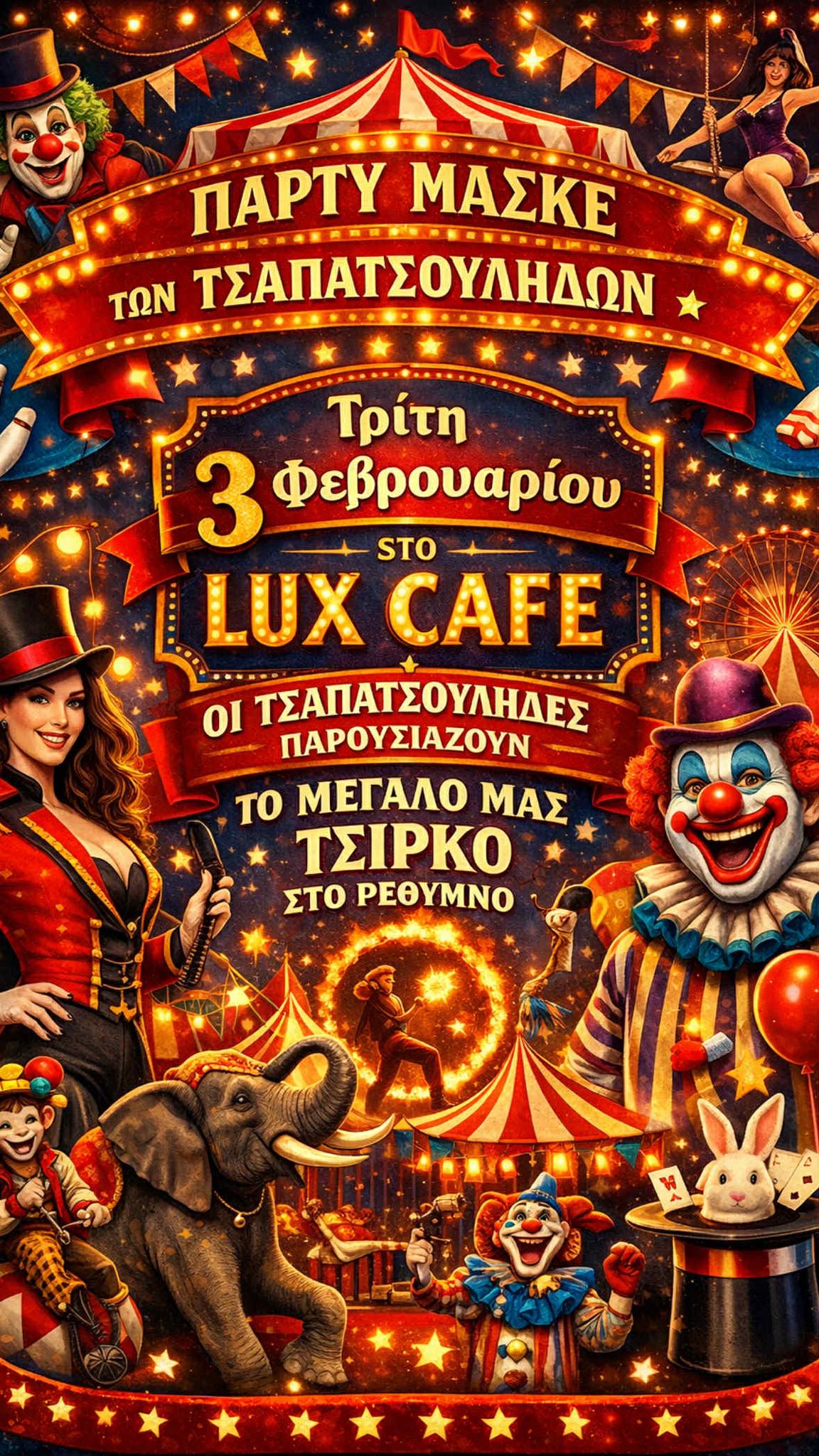 Lux Cafe Ελευθερίου Βενιζέλου 65, Ρέθυμνο, Ρεθύμνου, Ελλάδακαρναβάλι 2026 εκδηλώσειςΤΟ ΜΕΓΑΛΟ ΜΑΣ ΤΣΙΡΚΟ: Αποκριάτικος χορός της Καρναβαλικής Ομάδας «τσαΠΑΤΣΟύληδες» στο Lux Cafe (Ελ. Βενιζέλου 65-68)! Τρίτη 03 Φεβρουαρίου 2026