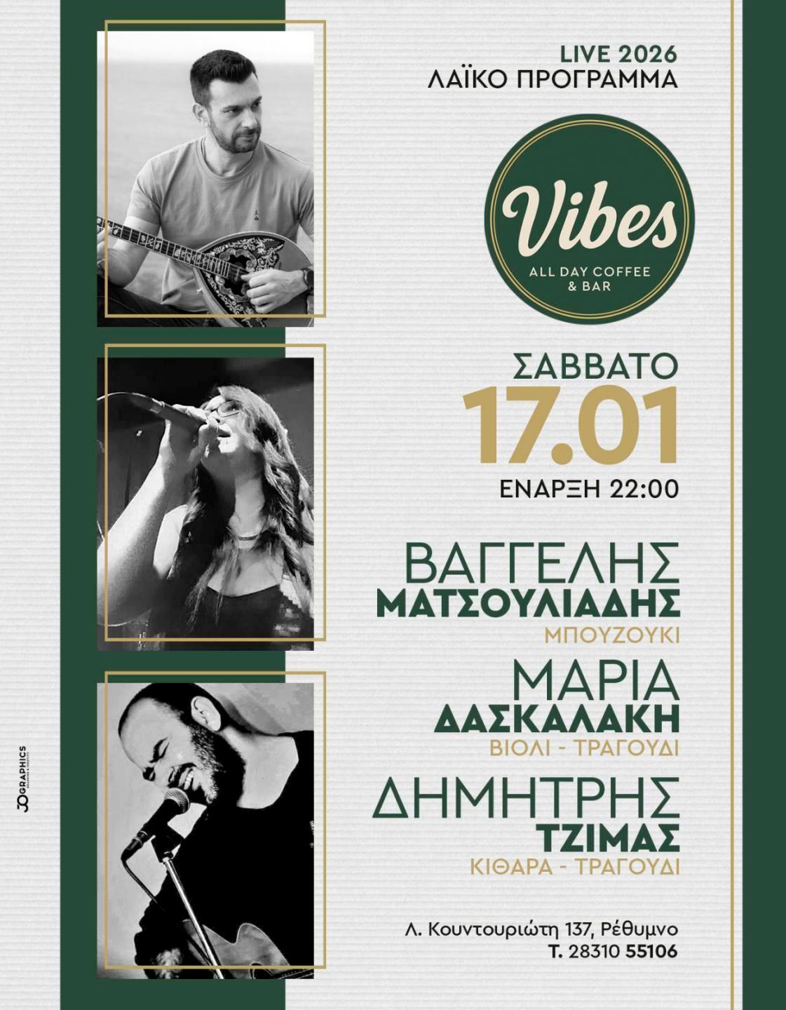Vibes All Day Coffee & Bar Κουντουριώτου 137, Ρέθυμνο, Κρήτη, GreeceΟ Δημήτρης Τζίμας, ο Βαγγέλης Ματσουλιάδης και η Μαρία Δασκαλάκη ζωντανά με λαϊκά τραγούδια στο Vibes All Day Coffee & Bar (Κουντουριώτου 137, Ρέθυμνο). Σάββατο 17 Ιανουαρίου - Έναρξη 22:00. Τηλ. 2831 055106.