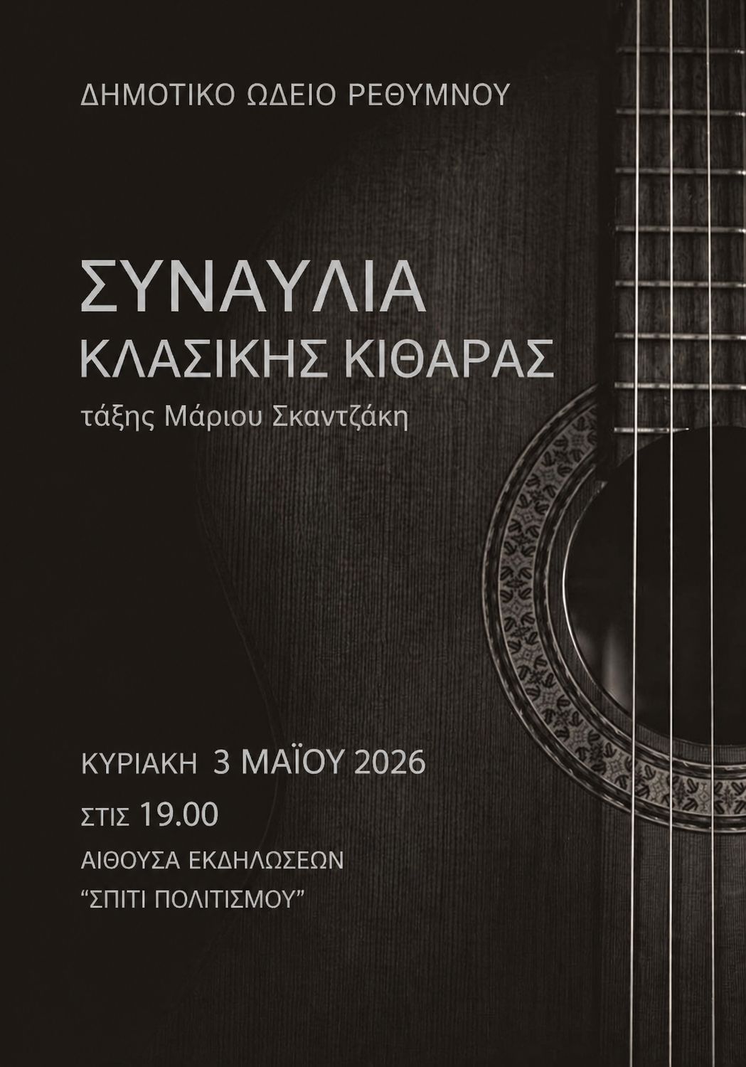 Συναυλία Κλασικής Κιθάρας διοργανώνει το Δημοτικό Ωδείο Ρεθύμνου, την Κυριακή, 03 Μαϊου στις 19:00,στο «Σπίτι του Πολιτισμού». Οι μαθητές της τάξης του Μάριου Σκαντζάκη θα παρουσιάσουν τα έργα και την πρόοδο τους σε μια εκδήλωση γεμάτη μελωδίες και συναισθήματα και προσκαλούν τους φιλόμουσους να την παρακολουθήσουν και να την απολαύσουν.
