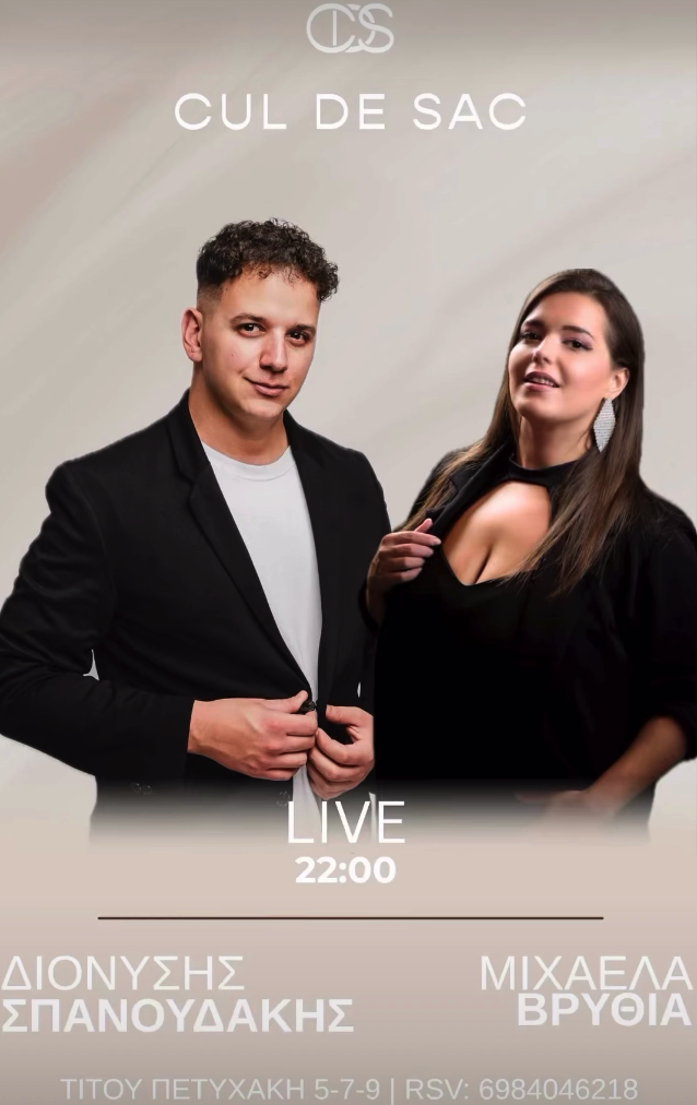Cul De Sac Τίτου Πετυχάκη 7, Ρέθυμνο, Ρεθύμνου, ΕλλάδαO Διονύσης Σπανουδάκης και η Μιχαέλα Βρυθιά ζωντανά στο Cul De Sac (Τίτου Πετυχάκη 5-9, Παλιά πόλη). Έναρξη 22:00. Τηλ. Κρατήσεων 6984 046218.