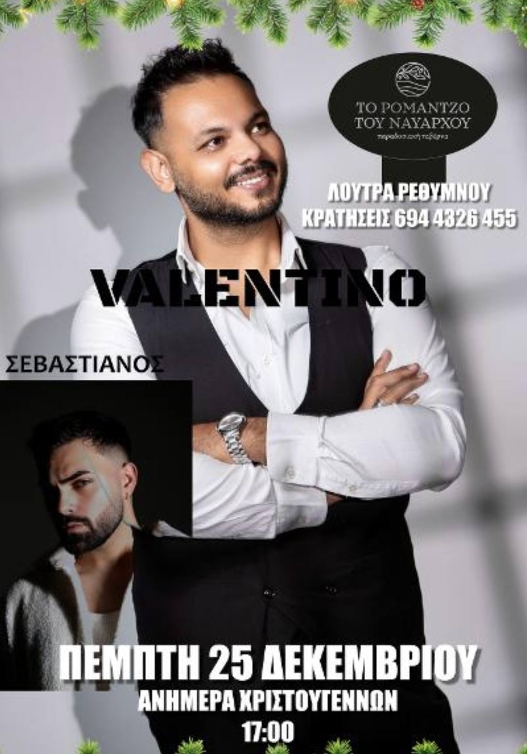 Ταβέρνα Το Ρομάντζο του Ναυάρχου Loutra, Ρεθύμνου, GreeceΜουσική βραδιά με τον Βαλεντίνο στην Ταβέρνα «Το Ρομάντζο του Ναυάρχου» (Λούτρα Ρεθύμνου). Μαζί του ο Σεβαστιανός. Ανήμερα των Χριστουγέννων, Πέμπτη 25 Δεκεμβρίου - Έναρξη 17.00. Τηλ. 6944 32 6455.