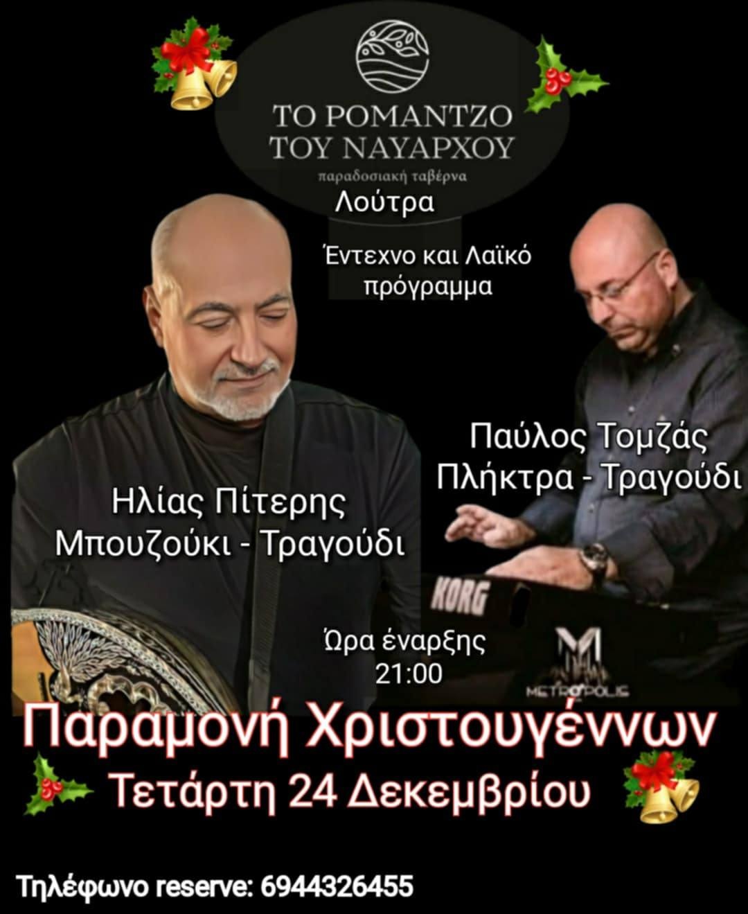 Ταβέρνα Το Ρομάντζο του Ναυάρχου Loutra, Ρεθύμνου, GreeceΜουσική βραδιά με τον Ηλία Πίτερη (μπουζούκι - τραγούδι) και τον Παύλο Τομζά (πλήκτρα - τραγούδι) στην Ταβέρνα «Το Ρομάντζο του Ναυάρχου» (Λούτρα Ρεθύμνου). Παραμονή Χριστούγέννων - Τετάρτη 24 Δεκεμβρίου […]