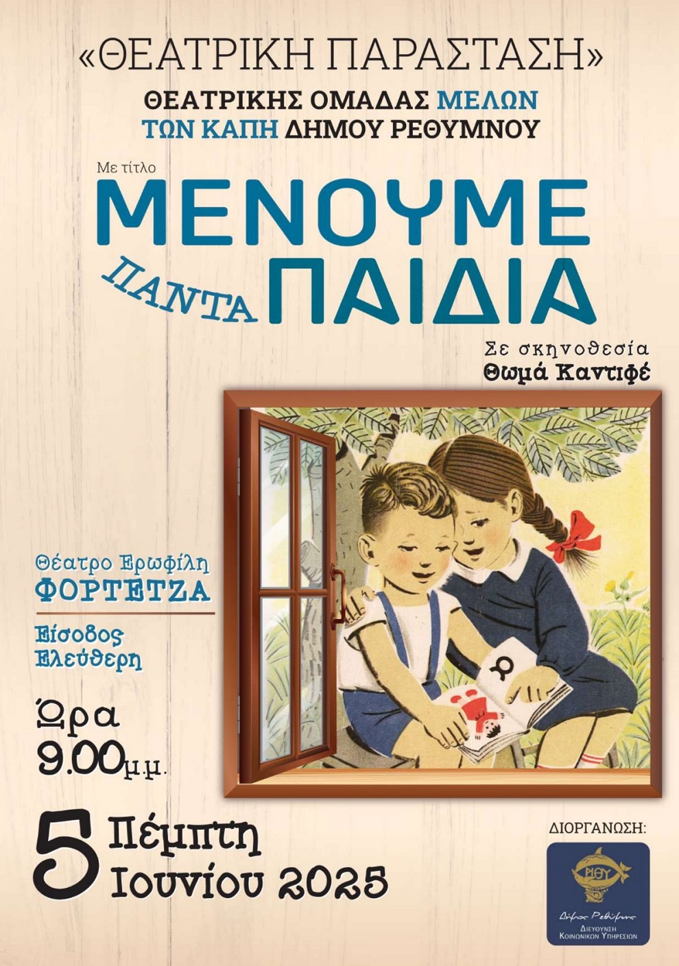 Η Περιφέρεια Κρήτης – Αντιπεριφέρεια Ρεθύμνου και το Μικρό Θέατρο Ρεθύμνου συνδιοργανώνουν και παρουσιάζουν τη θεατρική παράσταση «Ζώνη Αποκλεισμού» την Τρίτη 9 και την Τετάρτη 10 Δεκεμβρίου 2025, ώρα 21:00 στο Σπίτι του Πολιτισμού.Η παράσταση, που πραγματοποιείται σε σκηνοθεσία του Γιάννη Περογαμβράκη, είναι βασισμένη στο έργο “The Children” της βραβευμένης Βρετανίδας συγγραφέα Lucy Kirkwood, ένα […]