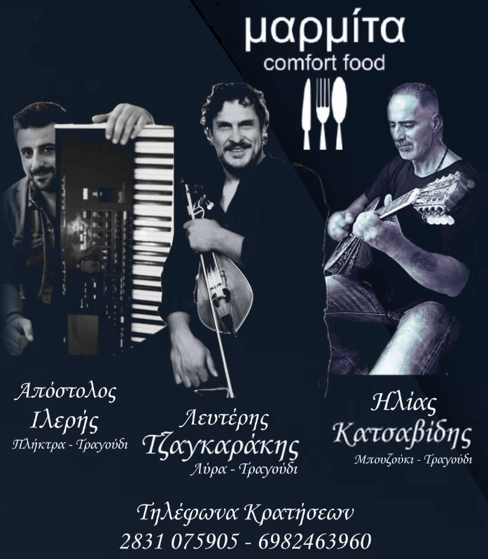 Ταβέρνα Μαρμίτα Roussospiti, Ρεθύμνου, GreeceΟ Λευτέρης Τζαγκαράκης ζωντανά στην Ταβέρνα «Μαρμίτα» στο Ρουσσοσπίτι Ρεθύμνου. Μαζί του ο Ηλίας Κατσαβίδης και ο Απόστολος Ιλερής. Παρασκευή 19 Δεκεμβρίου - Έναρξη 20:30. Τηλ. 28310 75905.