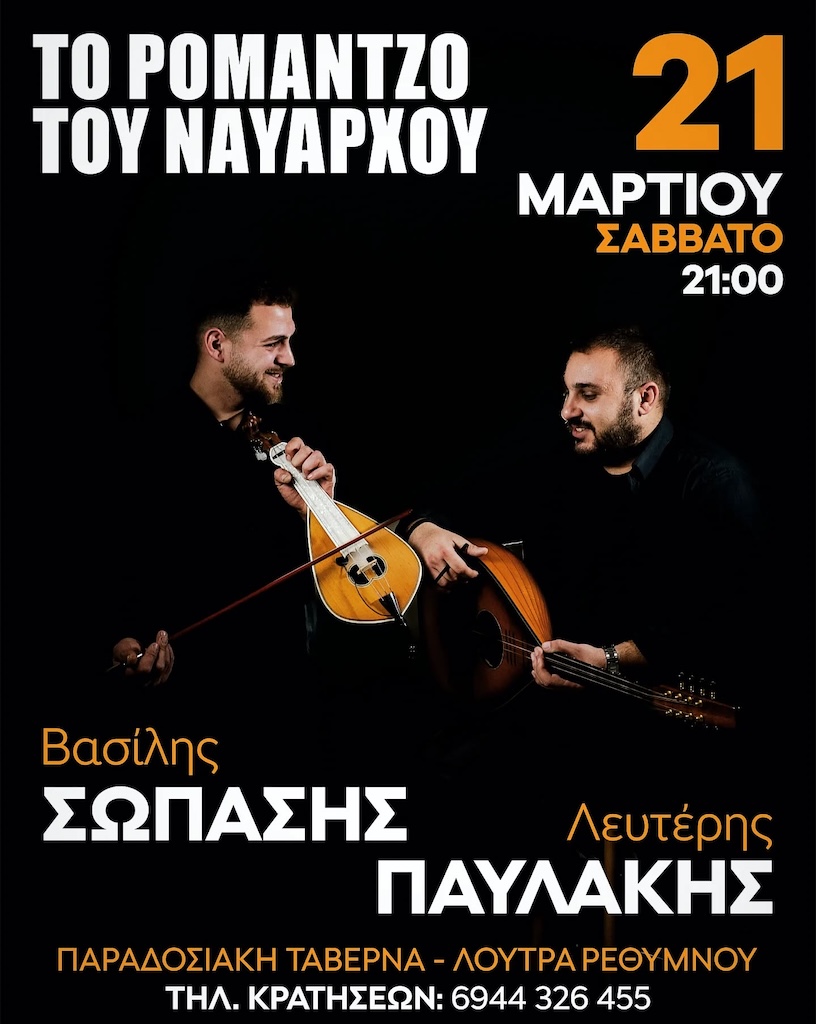 Ταβέρνα Το Ρομάντζο του Ναυάρχου Loutra, Ρεθύμνου, GreeceΟ Βασίλης Σωπασής και ο Λευτέρης Παυλάκης ζωντανά στην Ταβέρνα «Το Ρομάντζο του Ναυάρχου» (Λούτρα Ρεθύμνου). Τηλ. 6944 32 6455.