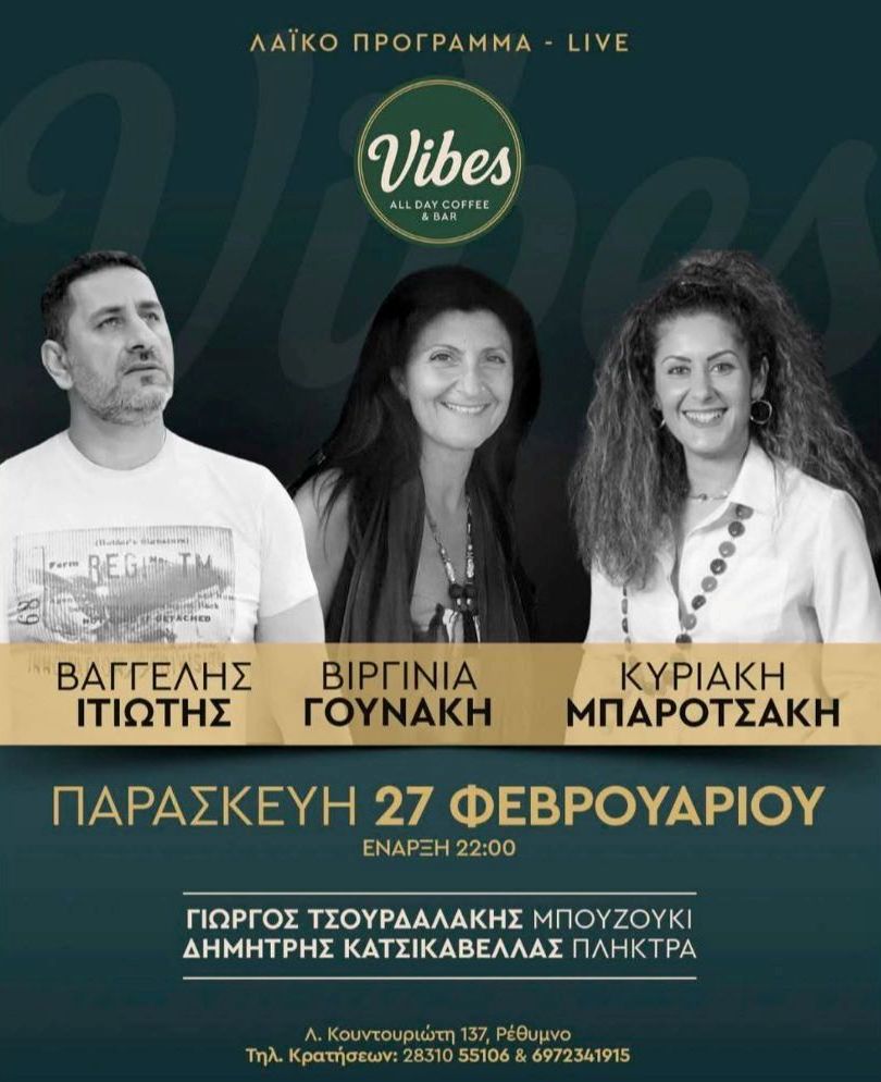 Vibes All Day Coffee & Bar Κουντουριώτου 137, Ρέθυμνο, Κρήτη, GreeceΟ Βαγγέλης Ιτιώτης, η Βιργινία Γουνάκη και η Κυριακή Μπαροτσάκη ζωντανά στο Vibes All Day Coffee & Bar (Κουντουριώτου 137, Ρέθυμνο). Έναρξη 22.00. Τηλ. 2831 055106.