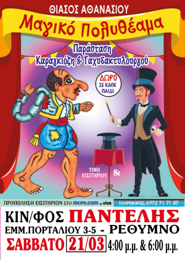 Cineland Παντελής Εμμανουήλ Πορτάλιου 3, Ρέθυμνο, Ρεθύμνου, ΕλλάδαΜία νέα παραγωγή του Θεάτρου σκιών Αθανασίου, με Καραγκιόζη και Ταχυδακτυλουργό, σε μία παράσταση! Ελάτε να διασκεδάσετε σε αυτό το μοναδικό θέαμα! Σας περιμένουμε όλους! Οι παραστάσεις θα πραγματοποιηθούν στον […]