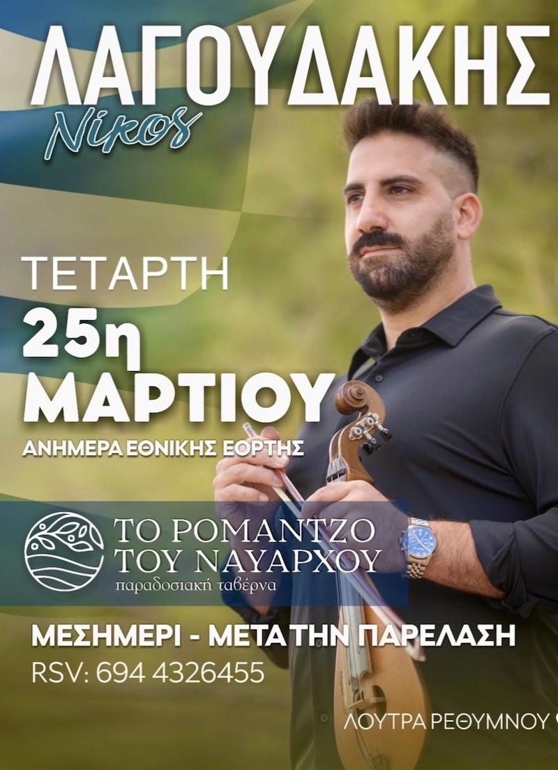 Ταβέρνα Το Ρομάντζο του Ναυάρχου Loutra, Ρεθύμνου, GreeceΚρητική μουσική με το Νίκο Λαγουδάκη στην Ταβέρνα «Το Ρομάντζο του Ναυάρχου» (Λούτρα Ρεθύμνου). Τετάρτη 25 Μαρτίου - Αμέσως μετά την παρέλαση. Τηλ. 6944 32 6455.