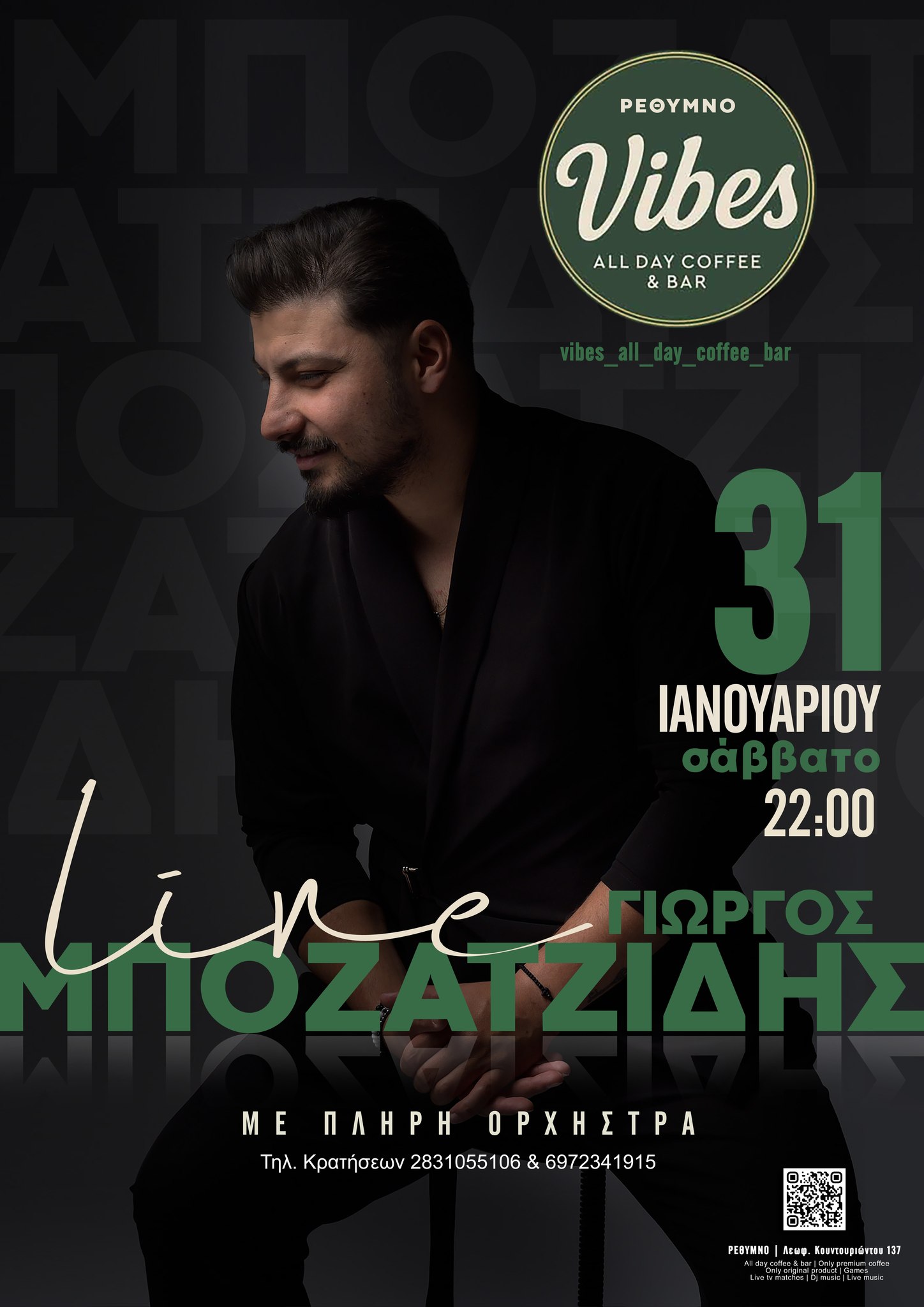 Vibes All Day Coffee & Bar Κουντουριώτου 137, Ρέθυμνο, Κρήτη, GreeceΟ Γιώργος Μποζατζίδης ζωντανά με λαϊκά τραγούδια στο Vibes All Day Coffee & Bar (Κουντουριώτου 137, Ρέθυμνο). Σάββατο 31 Ιανουαρίου - Έναρξη 22:00. Τηλ. 2831055106 & 6972344134