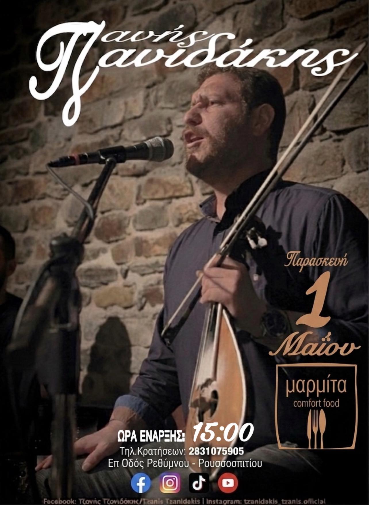 Ταβέρνα Μαρμίτα Roussospiti, Ρεθύμνου, GreeceΟ Τζανής Τζανιδάκης στην Ταβέρνα «Μαρμίτα» στο Ρουσσοσπίτι Ρεθύμνου. Πρωτομαγιά, Παρασκευή 1 Μαΐου - Έναρξη 15:00 Τηλ. 28310 75905.