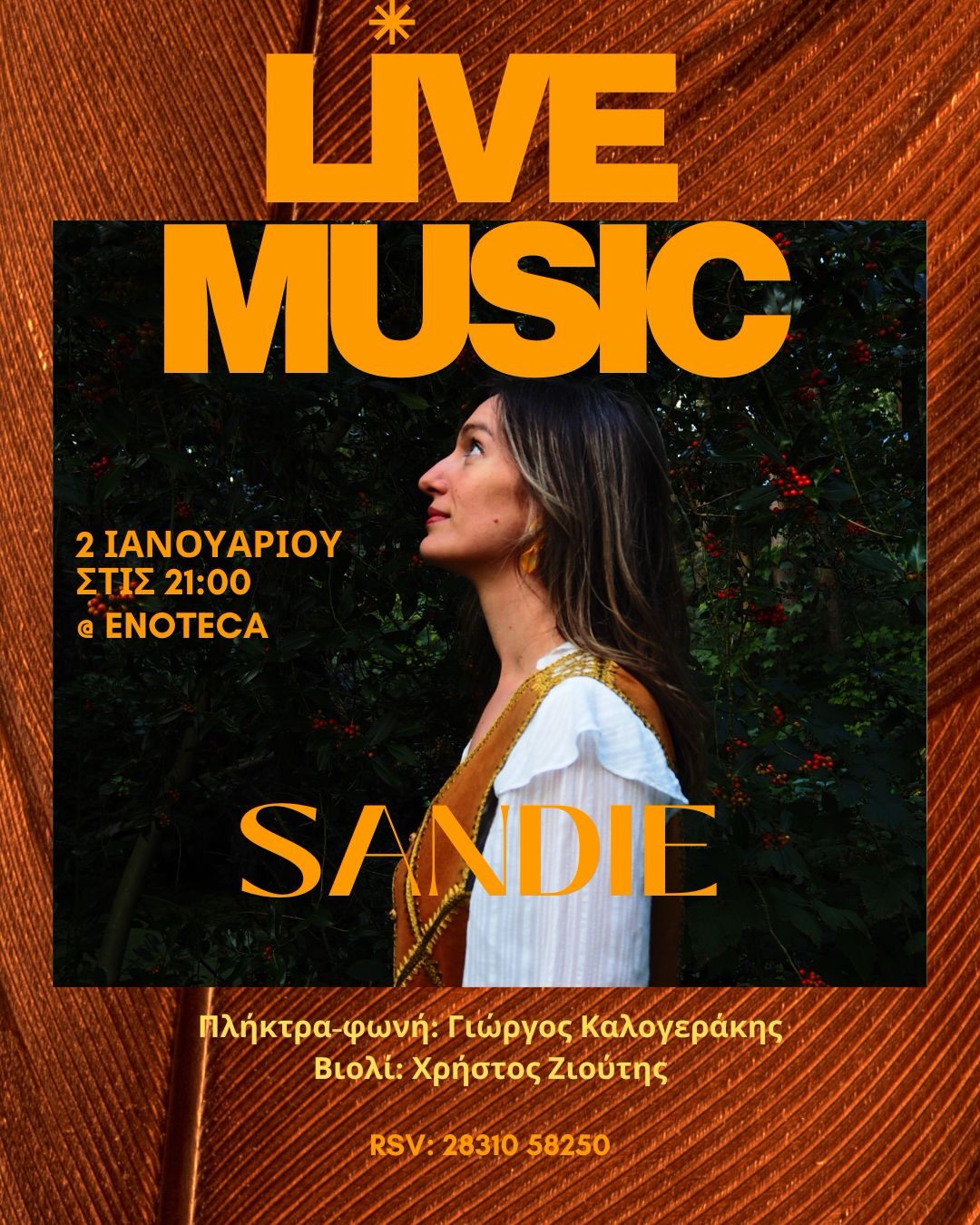 Οινοθήκη Ραδαμάνθυος 17, Ρέθυμνο, Ρεθύμνου, ΕλλάδαΜουσική βραδιά με την Sandie την Παρασκευή 2 Ιανουαρίου στην «Οινοθήκη» Μαζί της ο Γιώργος Καλογεράκης (πλήκτρα-φωνη) και ο Χρήστος Ζιούτης (βιολί). Τηλ. 28310 58250.