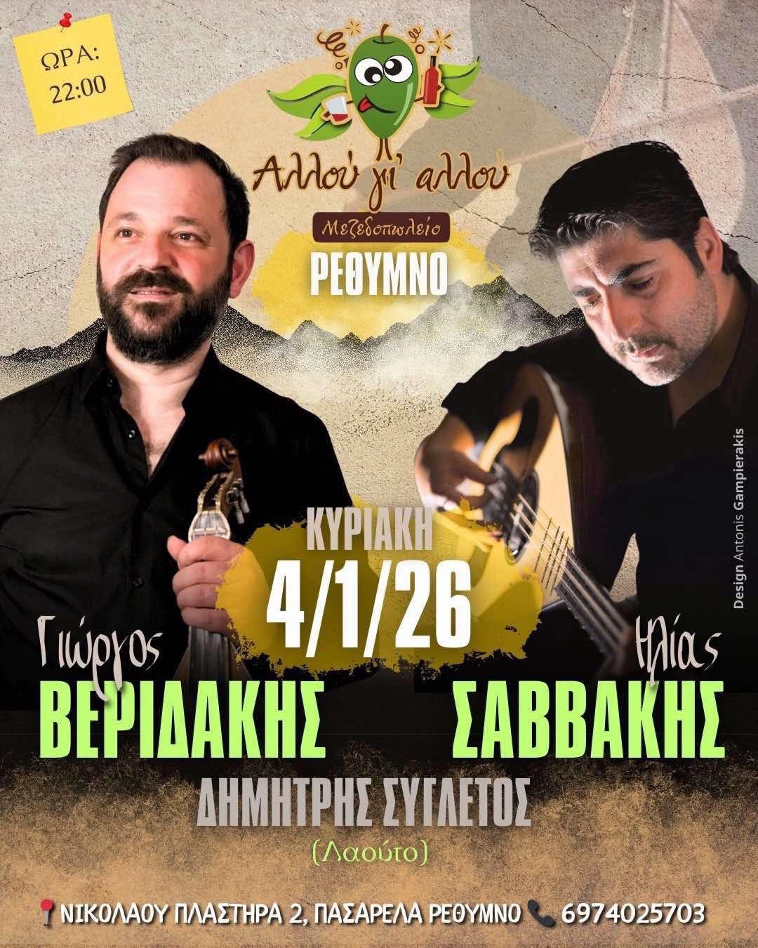 Μεζεδοπωλείο Αλλού γι' αλλού Νικολάου Πλαστήρα 2, Ρέθυμνο, Ρεθύμνου, ΕλλάδαΟ Γιώργος Βεριδάκης και ο Ηλίας Σαββάκης με το συγκρότημα τους ζωντανά στο Μεζεδοπωλείο «Αλλού γι' Αλλού». Κυριακή 4 Ιανουαρίου- 22.00. Τηλ. 6974025703