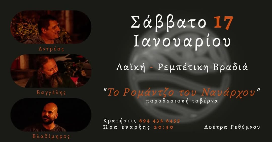 Μουσική βραδιά με λαϊκά και ρεμπέτικα, με τον Ανδρέα, τον Βαγγέλη και τον Βλαδίμηρο στην Ταβέρνα «Το Ρομάντζο του Ναυάρχου» (Λούτρα Ρεθύμνου). Σάββατο 17 Ιανουαρίου - Έναρξη 20:30. Τηλ. 6944 32 6455.