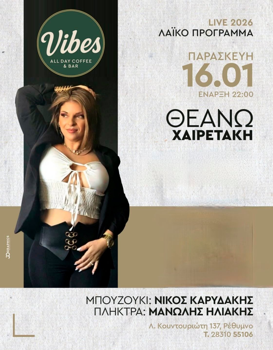 Μουσική βραδιά με τη Θεανώ Χαιρετάκη στο Vibes All Day Coffee & Bar (Κουντουριώτου 137, Ρέθυμνο). Παρασκευή 16 Ιανουαρίου - Έναρξη 22:00. Τηλ. 2831 055106. |