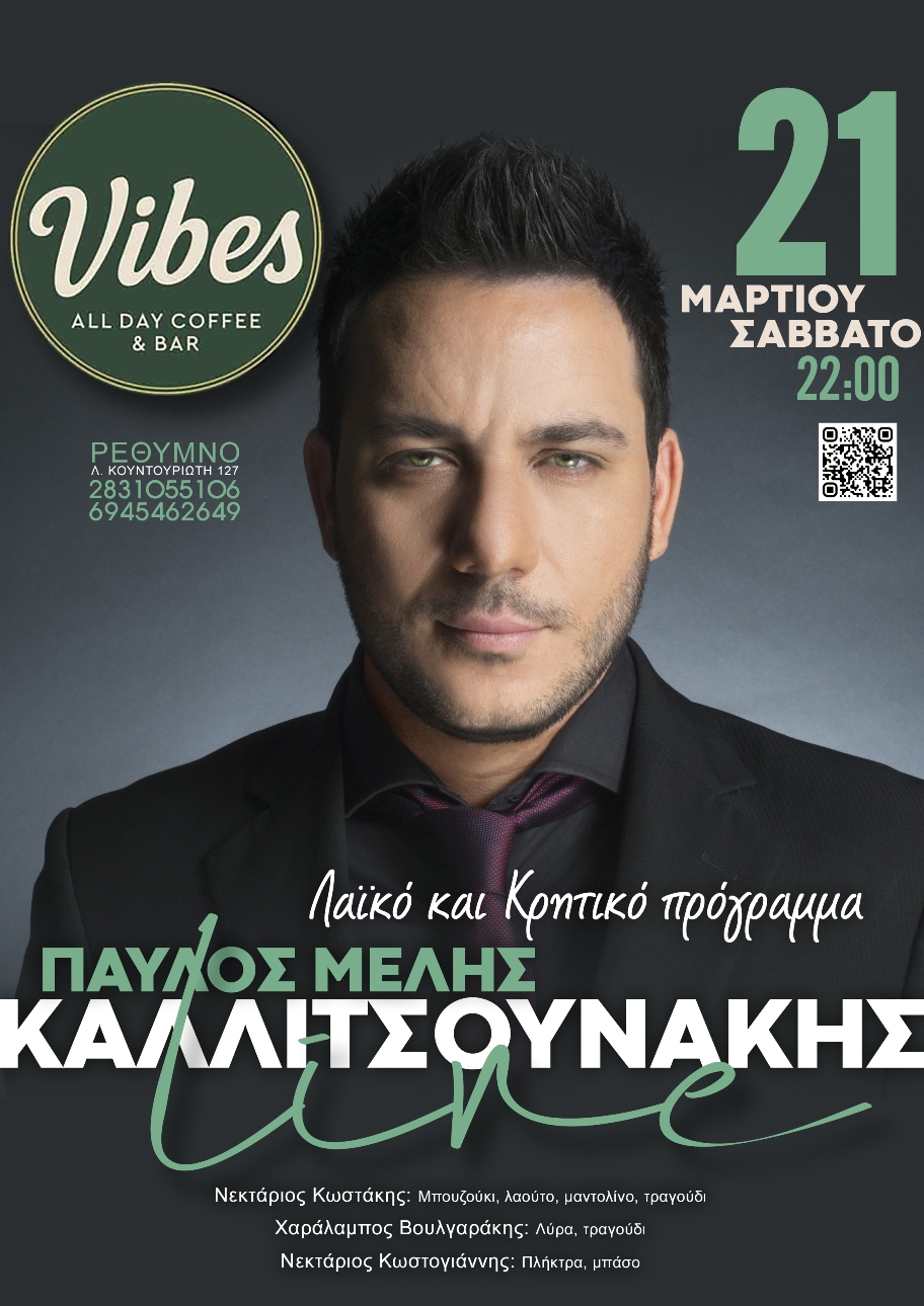 Ο Παύλος Μελής live στο Vibes All Day Coffee & Bar. Μαζί του η Αργυρώ Τσίτα. Παρασκευή 13/2/2026 - 22:00 Τηλ. κρατήσεων: 28310 55106