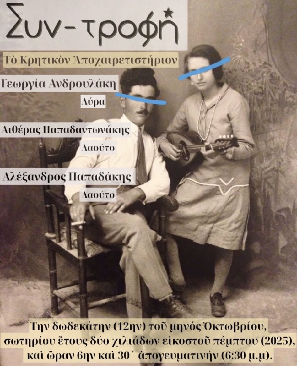Η Γεωργία Ανδρουλακη (λύρα), ο Αιθερας Παπαδαντωνακης (λαούτο) & ο Αλέξανδρος Παπαδάκης (λαούτο) σε ένα κρητικό γλέντι στη «Συν-Τροφή» (Κοραή & Κορωναίου, Παλιά πόλη - Ρέθυμνο). Κυριακή 12 Οκτωβρίου, από τις 18:30.