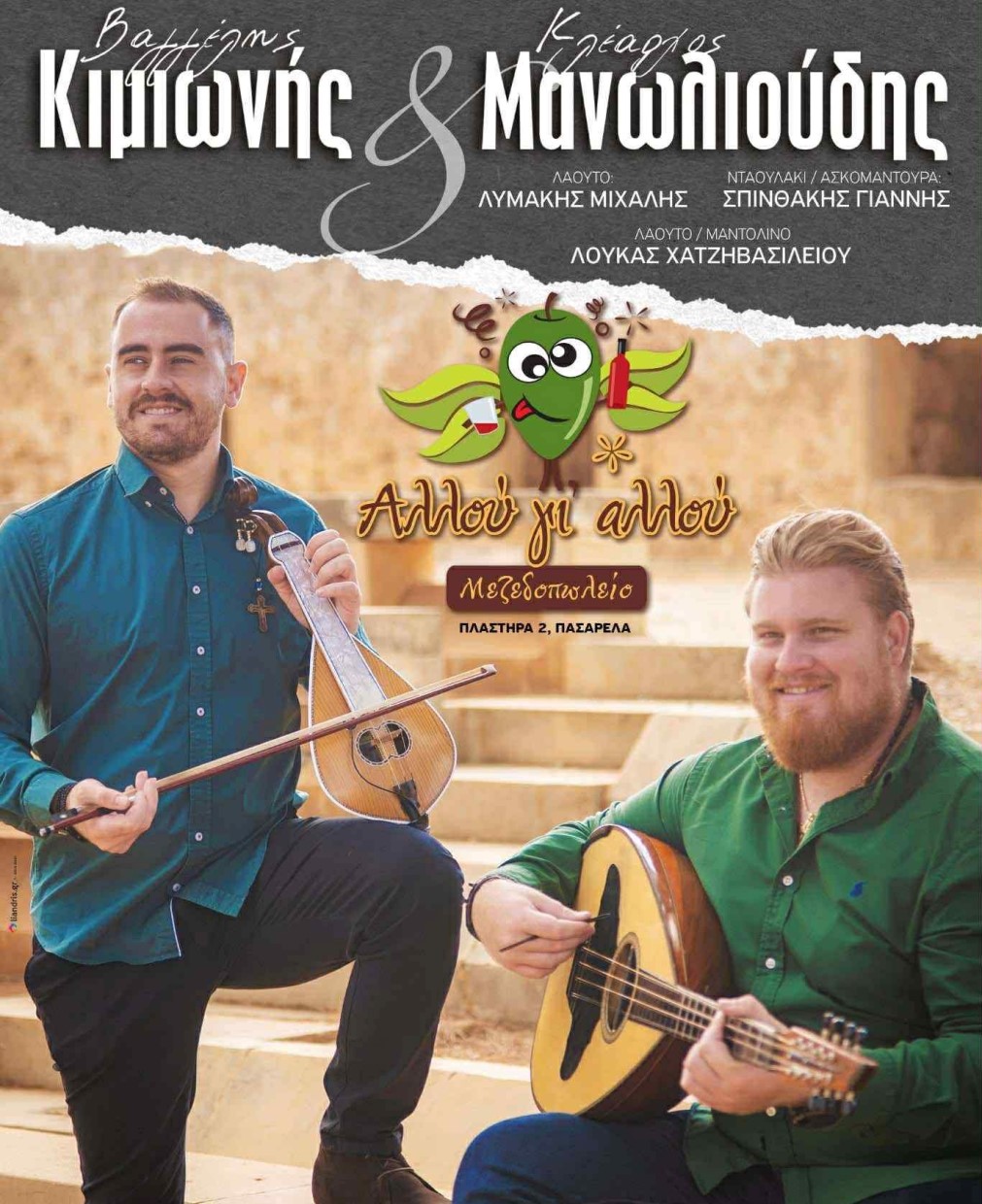 Ο Βασίλης Σταυρακάκης και ο Μιχάλης Καλλέργης με το συγκρότημα τους στο Cretan Aroma (Αγκουσελιανά Αγίου Βασιλείου). Είσοδος 20€ με πλήρες μενού. Διοργάνωση Α.Γ.Σ.Σ.Ν. Φοίνικας Τηλ. 6979 029483.