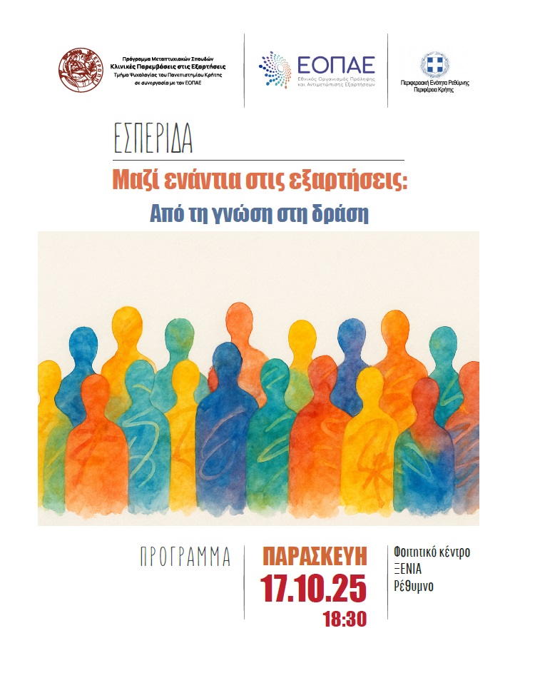 Το Πρόγραμμα Μεταπτυχιακών Σπουδών «Κλινικές Παρεμβάσεις στις Εξαρτήσεις» του Πανεπιστημίου Κρήτης, σε συνεργασία με τον Εθνικό Οργανισμό Πρόληψης και Αντιμετώπισης των Εξαρτήσεων (ΕΟΠΑΕ), διοργανώνει εσπερίδα την Παρασκευή 17 Οκτωβρίου και ώρα 18:30, στο Φοιτητικό Κέντρο «Ξενία» στο Ρέθυμνο, με θέμα: «Μαζί ενάντια στις εξαρτήσεις: Από τη γνώση στη δράση». Στο πλαίσιο της εσπερίδας θα υπογραφεί Σύμβαση […]