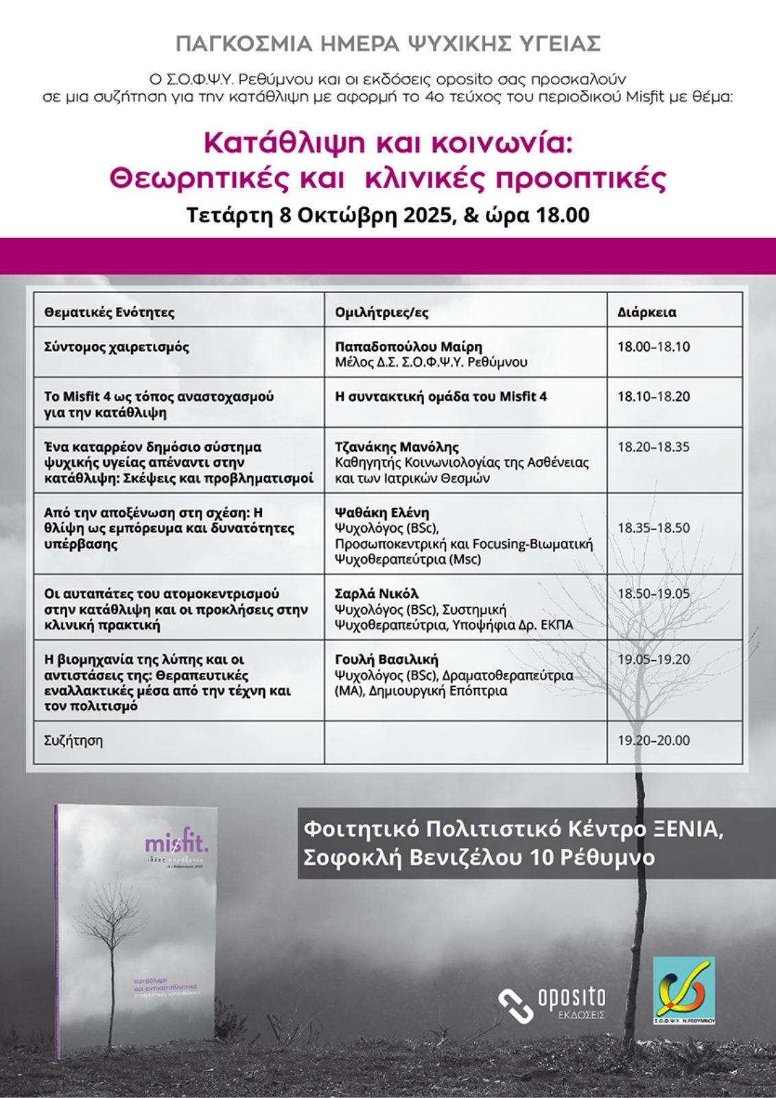 Οι εκδόσεις oposito και ο Σ.Ο.Φ.Ψ.Υ. (Σύλλογος Οικογενειών και Φίλων για την Ψυχική Υγεία) Ρεθύμνου σας προσκαλούν σε μια συζήτηση για την κατάθλιψη με αφορμή το 4ο τεύχος του περιοδικού Misfit με θέμα Κατάθλιψη και κοινωνία: Θεωρητικές και κλινικές προοπτικές. Την Τετάρτη 8 Οκτώβρη και ώρα 18.00 στο Πολιτιστικό Κέντρο ΞΕΝΙΑ (Σοφοκλή Βενιζέλου 10, Ρέθυμνο)