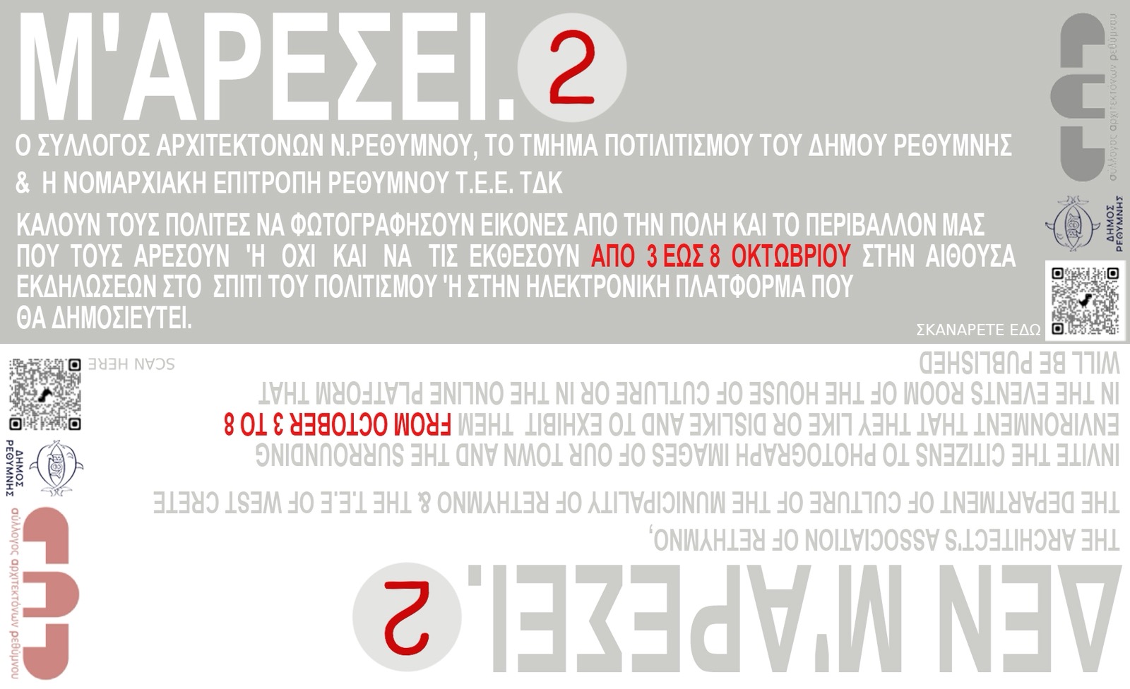 Ο Σύλλογος Αρχιτεκτόνων Ρεθύμνου καλεί για δεύτερη φορά, μετά από είκοσι χρόνια, τους κατοίκους του νομού μας να δηλώσουν τι τους αρέσει ή τι δεν τους αρέσει από το φυσικό και δομημένο περιβάλλον του. Σε συνδιοργάνωση με το Τμήμα Πολιτισμού του Δήμου Ρεθύμνου και τη Νομαρχιακή Επιτροπή του ΤΕΕ ΤΔΚ διοργανώνουν έκθεση φωτογραφίας με θέμα «Μ’ […]