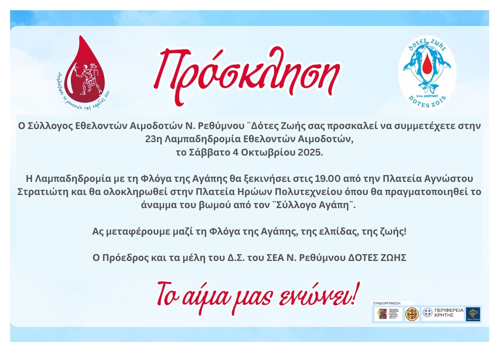 Ο Σύλλογος Εθελοντών Αιμοδοτών Ν. Ρεθύμνου "Δότες Ζωής" σας προσκαλεί στην 23η Λαμπαδηδρομία Εθελοντών Αιμοδοτών, το Σάββατο 4 Οκτωβρίου 2025, στο Ρέθυμνο. Η Φλόγα της Αγάπης θα φτάσει στις 19.00 στην Πλατεία Αγνώστου Στρατιώτη, σηματοδοτώντας την έναρξη της Λαμπαδηδρομίας, η οποία θα καταλήξει στην Πλατεία Ηρώων Πολυτεχνείου στις 19.30, όπου θα γίνει το άναμμα του βωμού από […]