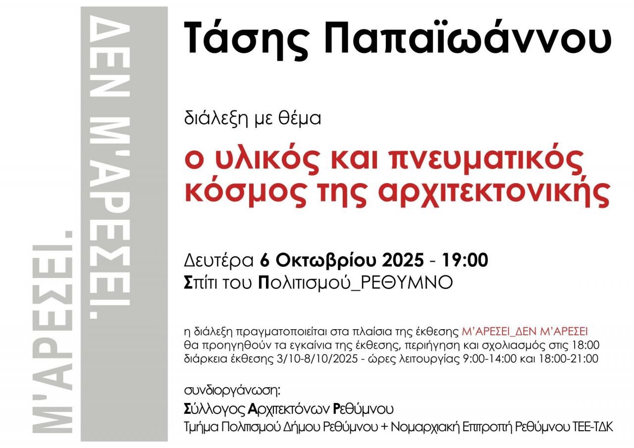 Ο Σύλλογος Αρχιτεκτόνων Ρεθύμνου σε συνδιοργάνωση με το Τμήμα Πολιτισμού του Δήμου Ρεθύμνου και τη Νομαρχιακή Επιτροπή του ΤΕΕ ΤΔΚ διοργανώνουν τη διάλεξη του διακεκριμένου αρχιτέκτονα και καθηγητή του ΕΜΠ Τάση Παπαϊωάννου, με θέμα «Ο υλικός και πνευματικός κόσμος της αρχιτεκτονικής», τη Δευτέρα 6 Οκτωβρίου 2025 και ώρα 19:00 στο Σπίτι του Πολιτισμού (Εμμ. Βερνάδου […]