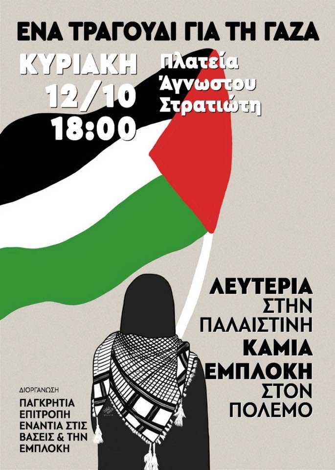 Σε συναυλία αλληλεγγύης στον Παλαιστινιακό λαό, «ΕΝΑ ΤΡΑΓΟΥΔΙ ΓΙΑ ΤΗ ΓΑΖΑ», καλεί σε μαζική συμμετοχή τους Ρεθεμνιώτες, η Επιτροπή Ειρήνης Ρεθύμνου, αυτήν την Κυριακή 12 Οκτωβρίου, στις 18:00 στην πλατεία Αγνώστου Στρατιώτη. Αναλυτικά η ανακοίνωση: «2 χρόνια συμπληρώνονται από τότε που ξεκίνησε το μεγαλύτερο έγκλημα του 21ου αιώνα, η γενοκτονία του Παλαιστινιακού λαού. 2 χρόνια […]