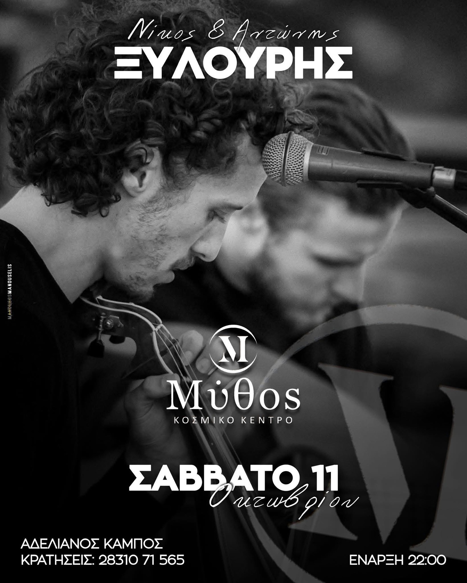 Ο Νίκος και ο Αντώνης Ξυλούρης ζωντανά στο Ρέθυμνο, στο Κοσμικό Κέντρο Μύθος (Αδελιανός Κάμπος), το Σάββατο 11 Οκτωβρίου. Έναρξη 22.00. Τηλ. 28310 71565 |