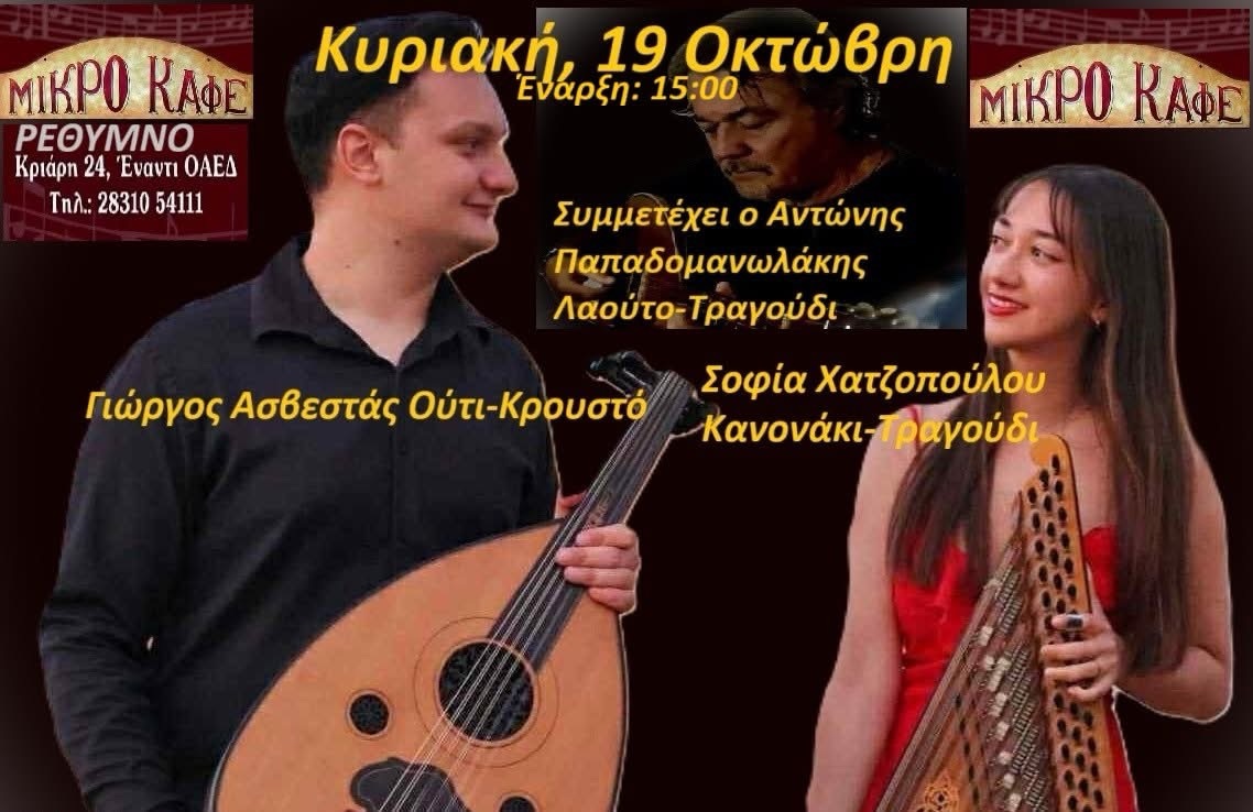 Ένα μουσικό ταξίδι από την Θράκη ως την Κρήτη με τους εξαιρετικούς μουσικούς Σοφία Χατζοπούλου στο κανονάκι και στο τραγούδι και τον Γιώργο Ασβεστά στο ούτι και στα κρουστά. Θα συμμετέχει και ο Αντώνης Παπαδομανωλάκης στο λαούτο και στο τραγούδι. Μικρό Καφέ (Κριάρη 24, Ρέθυμνο) Κυριακή 19 Οκτωβρίου - Έναρξη 15:00