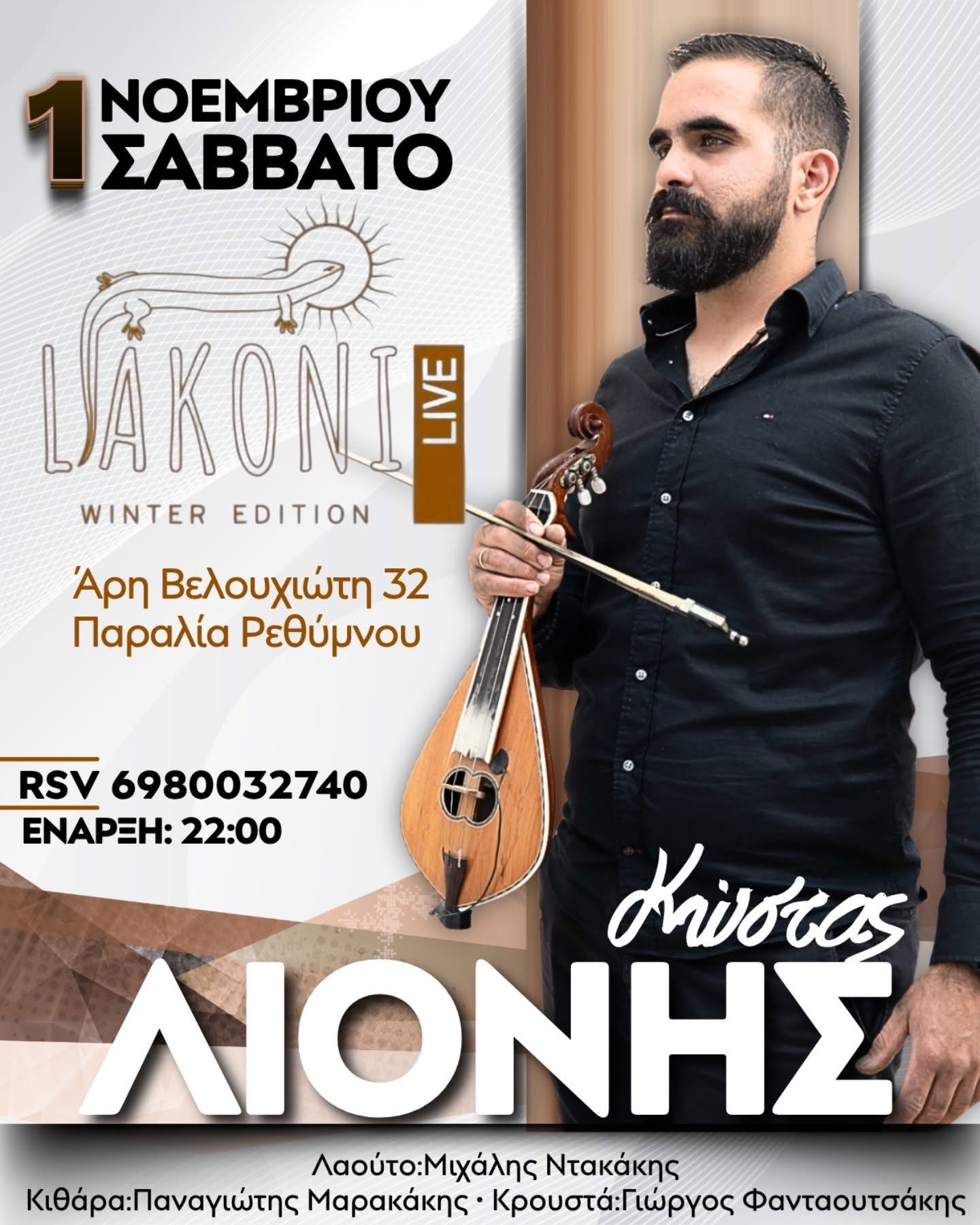 O Κωστας Λιονής (λύρα) με το συγκρότημα του ζωντανά στο Liakoni (Άρη Βελουχιώτη 32, Παραλιακή Ρεθύμνου) το Σάββατο 1 Νοεμβρίoυ 2025. Τηλ. για κρατήσεις 6980032740. |