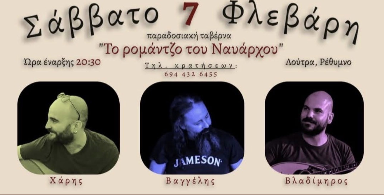 Μουσική βραδιά με λαϊκά και ρεμπέτικα, με τον Χάρη, τον Βαγγέλη και τον Βλαδίμηρο στην Ταβέρνα «Το Ρομάντζο του Ναυάρχου» (Λούτρα Ρεθύμνου). Σάββατο 7 Φεβρουαρίου- Έναρξη 20:30. Τηλ. 6944 32 6455.