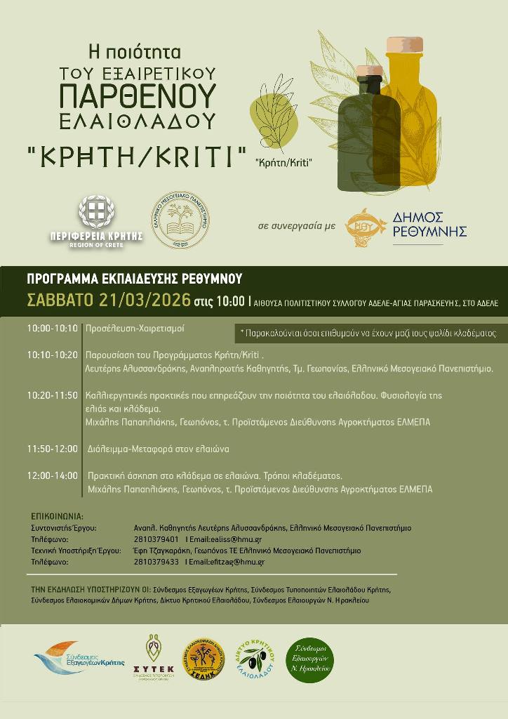 Η Περιφέρεια Κρήτης και το Ελληνικό Μεσογειακό Πανεπιστήμιο (ΕΛΜΕΠΑ), σε συνεργασία με τον Δήμο Ρεθύμνου, διοργανώνουν ημερίδα με θέμα: «Η ποιότητα του εξαιρετικού παρθένου ελαιολάδου ΚΡΗΤΗ/KRITΙ». Η ημερίδα πραγματοποιείται στο πλαίσιο των εκπαιδεύσεων για το ελαιόλαδο και απευθύνεται σε παραγωγούς, ελαιοτριβείς, τυποποιητές καθώς και σε κάθε ενδιαφερόμενο που επιθυμεί να ενημερωθεί για θέματα που αφορούν […] |