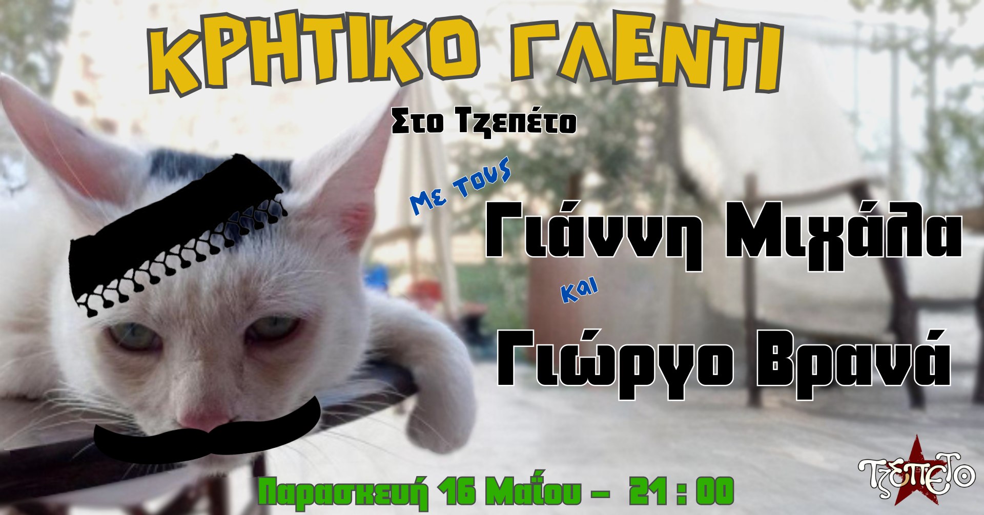 Κρητική βραδιά με τους Αποστόλη Τζαγκαράκη και Στέφανο Γαβαλα με το συγκρότημα τους στο μεζεδοπωλείο «Αλλού γι' αλλού». Τηλέφωνο κρατήσεων 6974025703.